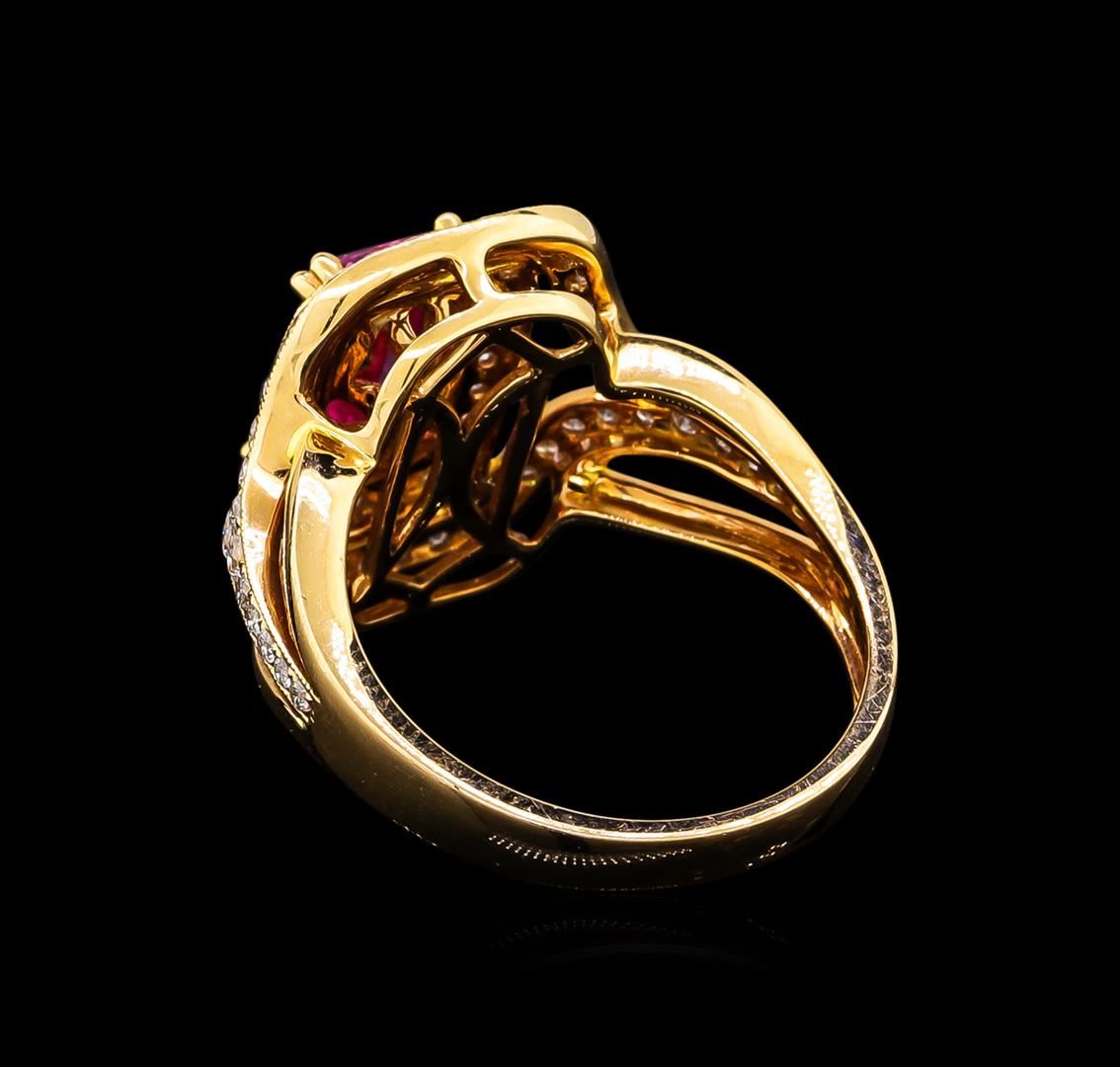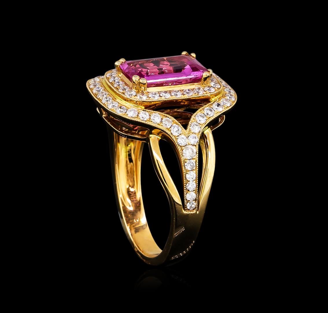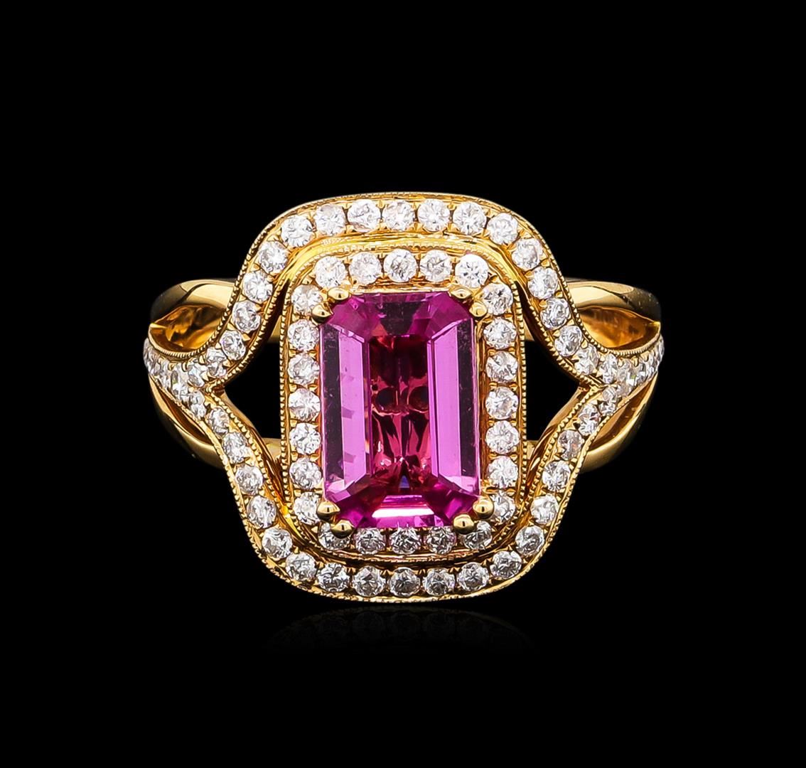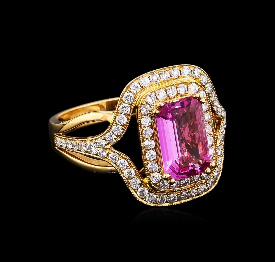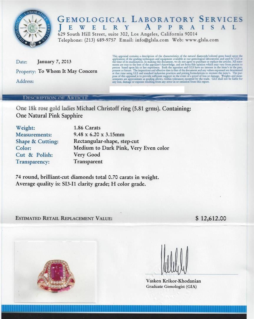 One 18k rose gold ladies Michael Christoff ring (5.81 grams). Containing: 1 Natural Pink Sapphire. Weight: total 1.86 carats. Measurements: 9.48 x 6.20 x 3.15mm. Shape & Cutting: rectangular-shape, step-cut. Color: medium to dark pink, very even color. Cut & Polish: very good. Transparency: transparent. 74 round, brilliant-cut diamonds total 0.70 carats in weight. Average quality is: SI3-I1 clarity grade; H color grade. GLS Appraised at $12,612.00.
