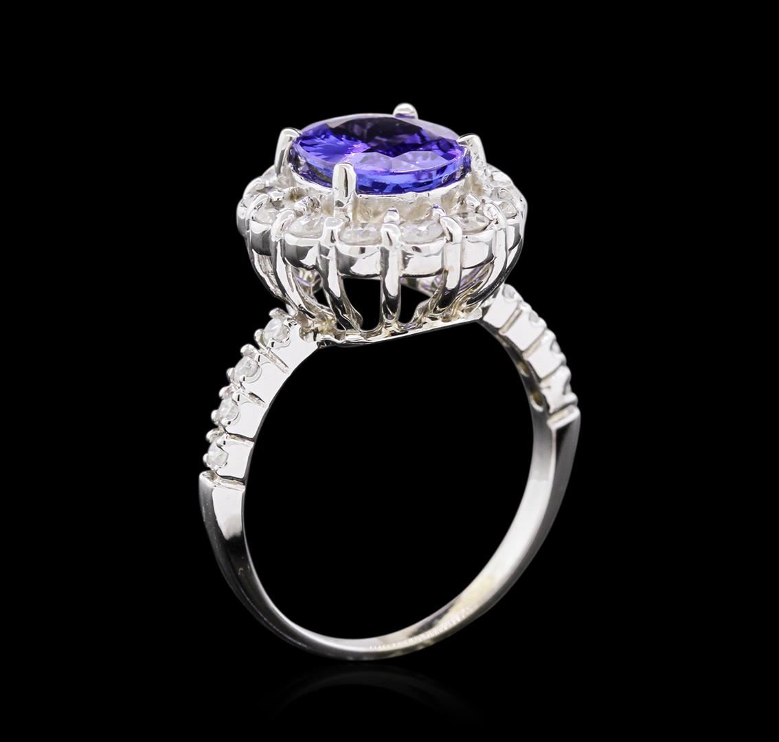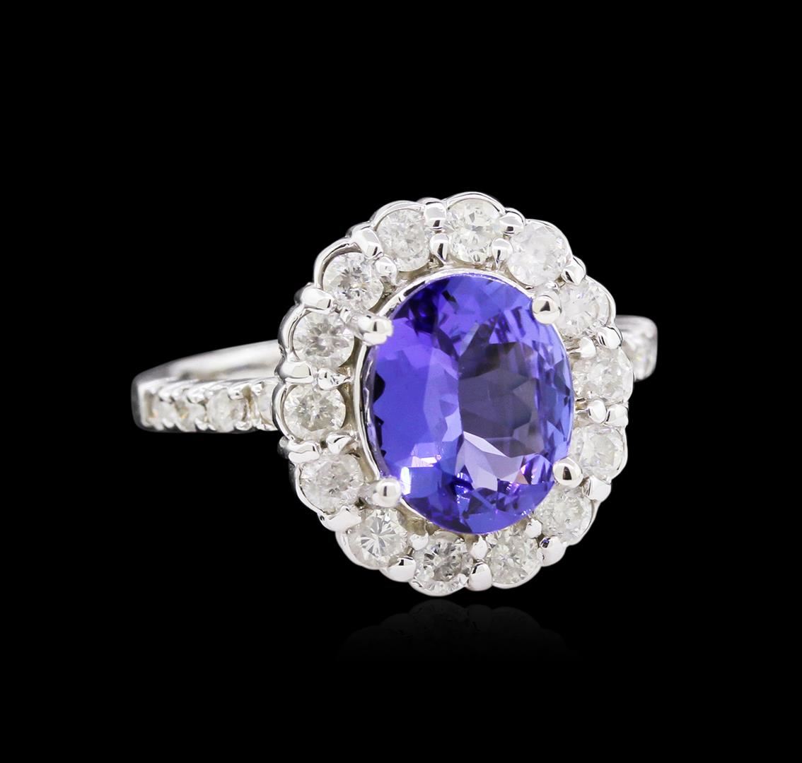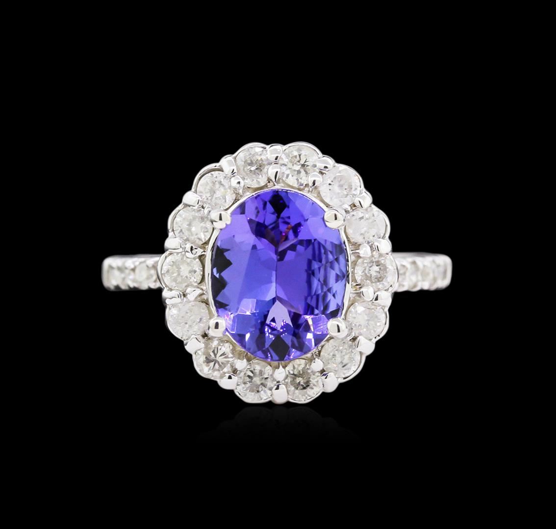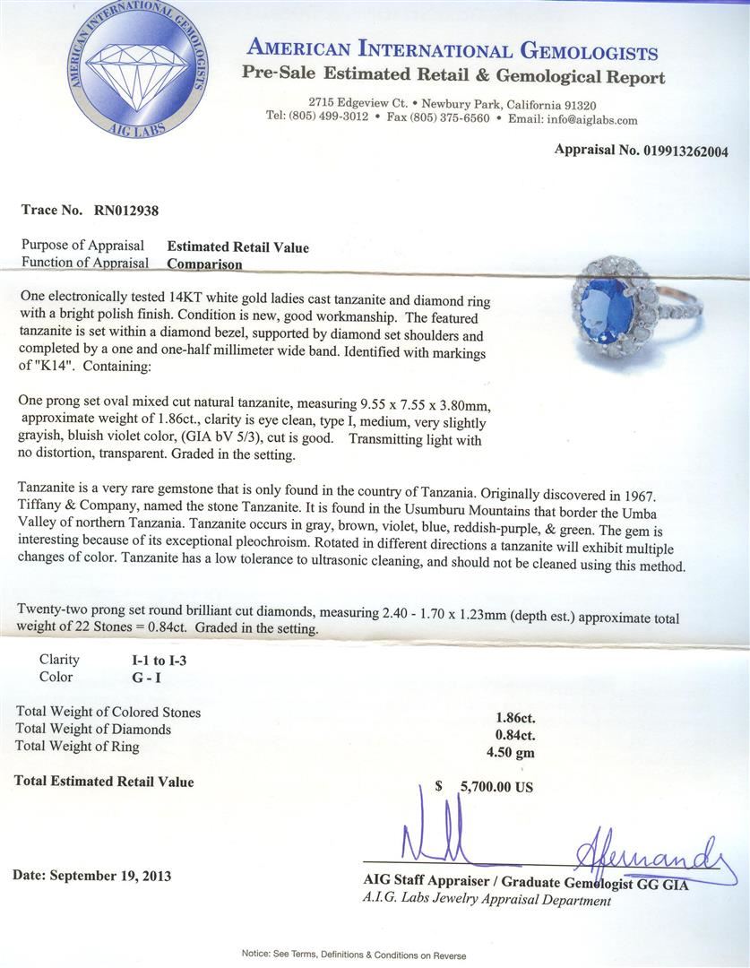 One electronically tested 14KT white gold ladies cast tanzanite and diamond ring with a bright polish finish. The featured tanzanite is set within a diamond bezel, supported by diamond set shoulders and completed by a one and one-half millimeter wide band. Identified with markings of "K14". Condition is new, good workmanship. Containing: One prong set oval mixed cut natural tanzanite, measuring 9.55 x 7.55 x 3.80mm, approximate weight of 1.86ct., clarity is eye clean, type I, medium, very slightly grayish, bluish violet color, (GIA bV 5/3), cut is good. Transmitting light with no distortion, transparent. Graded in the setting. Tanzanite is a very rare gemstone that is only found in the country of Tanzania. Originally discovered in 1967. Tiffany & Company, named the stone Tanzanite. It is found in the Usumburu Mountains that border the Umba Valley of northern Tanzania. Tanzanite occurs in gray, brown, violet, blue, reddish-purple, & green. The gem is interesting because of its exceptional pleochroism. Rotated in different directions a tanzanite will exhibit multiple changes of color. Tanzanite has a low tolerance to ultrasonic cleaning, and should not be cleaned using this method. Twenty-Two prong set round brilliant cut diamonds, measuring 2.40 - 1.70 x 1.23mm (depth est.) approximate total weight of 22 Stones = 0.84ct. Graded in the setting. Clarity: I-1 to I-3. Color: G - I. Total Weight of Colored Stones 1.86ct. Total Weight of Diamonds 0.84ct. AIG Appraised at $5,700.00.