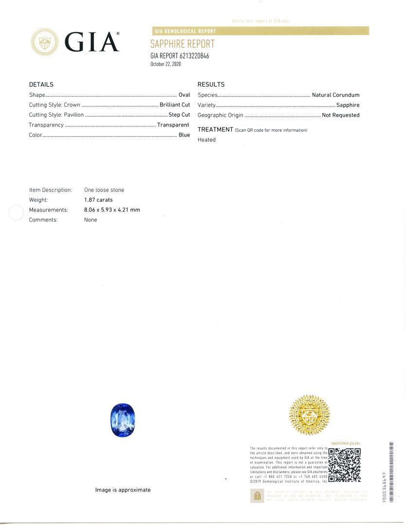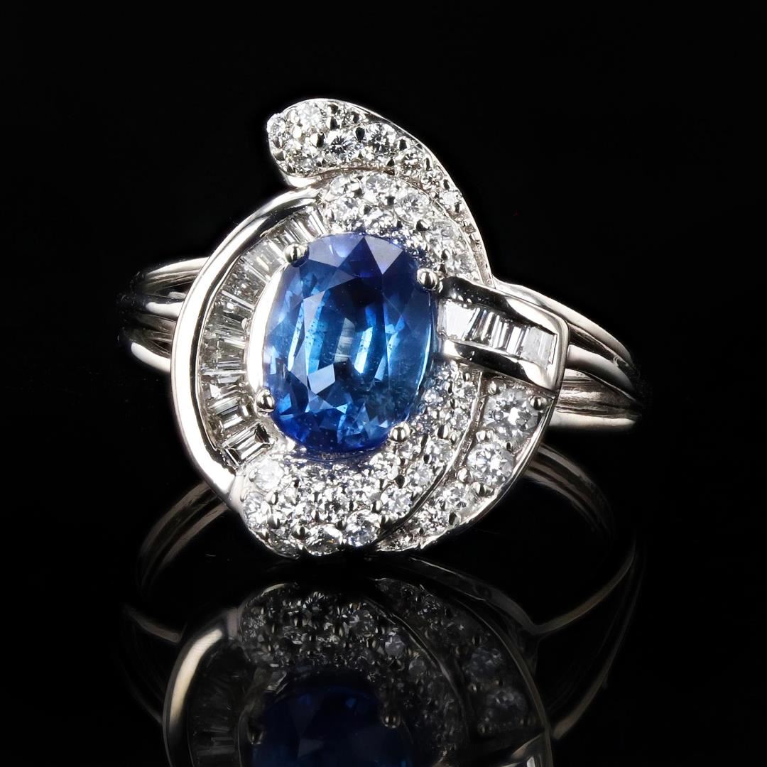 One electronically tested platinum ladies cast blue sapphire & diamond ring. Condition is new, good workmanship. The featured sapphire is set within a multi-tiered diamond bezel, supported by a ribbed under gallery and split - shoulders, completed by a combined two millimeter wide band. Bright polish finish. Trademark is Orianne. Identified with markings of "PT950" One prong set oval mixed cut natural blue sapphire, measuring 8.06 x 5.93 x 4.21mm, exact weight 1.87ct., clarity is slightly included, type II, medium, moderately strong, blue color, (GIA B 5/4), cut is good. Transmitting light with a minimum of distortion, transparent. Naturally occurring internal & external characteristics are present. Graded loose prior to setting in the GIA Laboratory, Report No. 6213220846. The report is attached Fifty-five prong & channel set round brilliant & tapered baguette cut diamonds approximate total weight of 55 Stones = 0.54ct. The clarity & color grade reflect the overall average for the group. Graded in the setting Clarity VS-2 to SI-2 Color F - H Total Weight of Colored Stones 1.87ct Total Weight of Diamonds 0.54ct Total Weight of Ring 6.50gm #LREF-4797