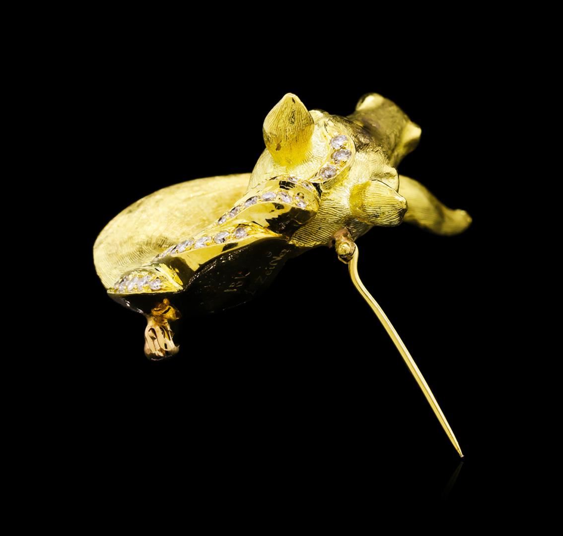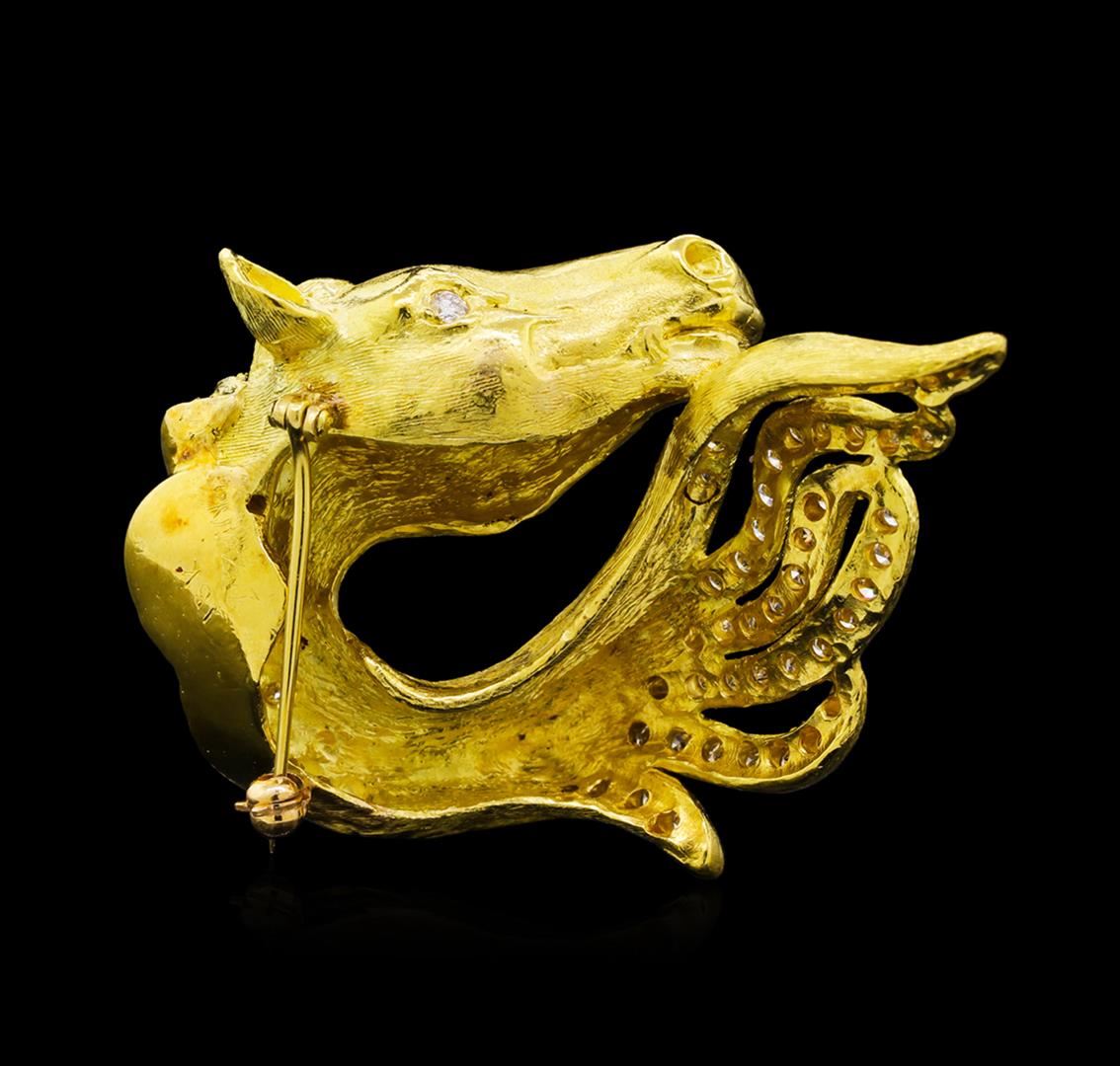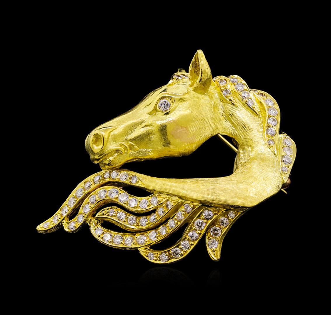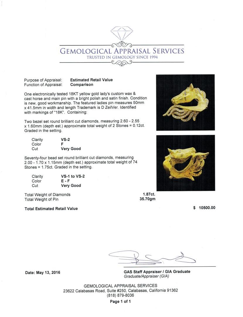 One electronically tested 18KT yellow gold lady's custom wax & cast horse and main pin with a bright polish and satin finish. The featured ladies pin measures 50mm x 41.5mm in width and length Trademark is D ZeilVer. Identified with markings of "18K". Condition is new, good workmanship. Containing: Two bezel set round brilliant cut diamonds, measuring 2.60 - 2.55 x 1.60mm (depth est.) approximate total weight of 2 Stones = 0.12ct. Graded in the setting. Clarity: VS-2. Color: F. Cut Very Good Seventy-Four bead set round brilliant cut diamonds, measuring 2.00 - 1.70 x 1.15mm (depth est.) approximate total weight of 74 Stones = 1.75ct. Graded in the setting. Clarity: VS-1 to VS-2. Color: E - Very Good. Total Weight of Diamonds 1.87ct. Total Weight of Pin 35.70gm. GAS Appraised at $10,500.00.