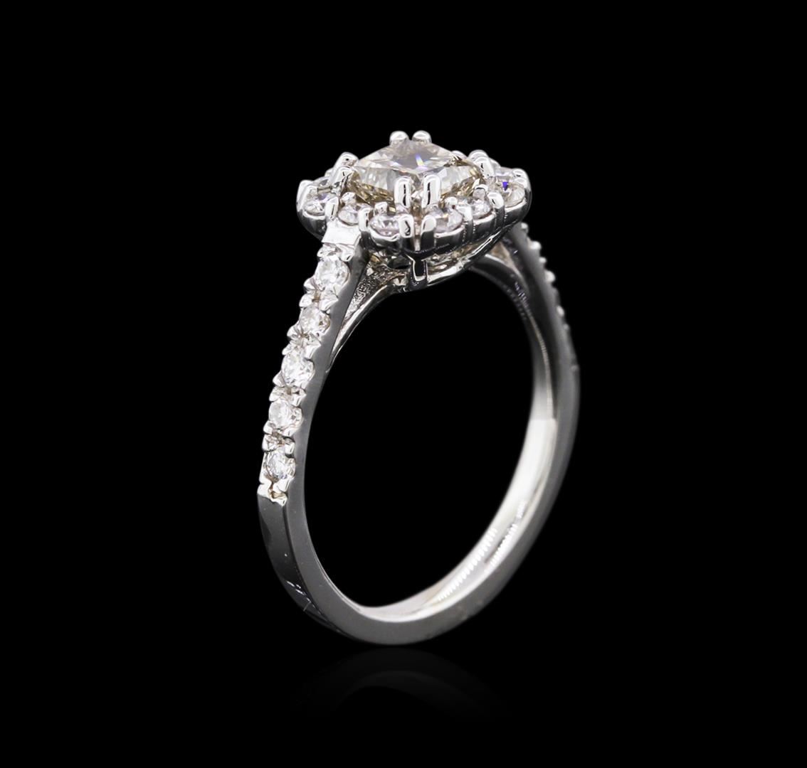One electronically tested 14KT white gold ladies cast diamond engagement ring with a bright polish finish. Identified with markings of "14K". Condition is new. Containing: One prong set radiant shaped cut diamond, measuring 5.50 x 5.30 x 3.24mm (depth est.) approximate weight of 1.02ct. Clarity: I-1. Color: M, Cut is Good. Twenty-Two prong set round brilliant cut diamonds, measuring 2.00 - 1.50 x 1.05mm (depth est.) approximate total weight of 22 Stones = 0.85ct. Clarity: SI-1. Color: I - J, Cut is Good. Diamonds are graded in the mounting, unless otherwise stated. Total Weight of Diamonds 1.87ct. Total Weight of Engagement Ring 3.80 grams. GGL Appraised at $3,975.00.