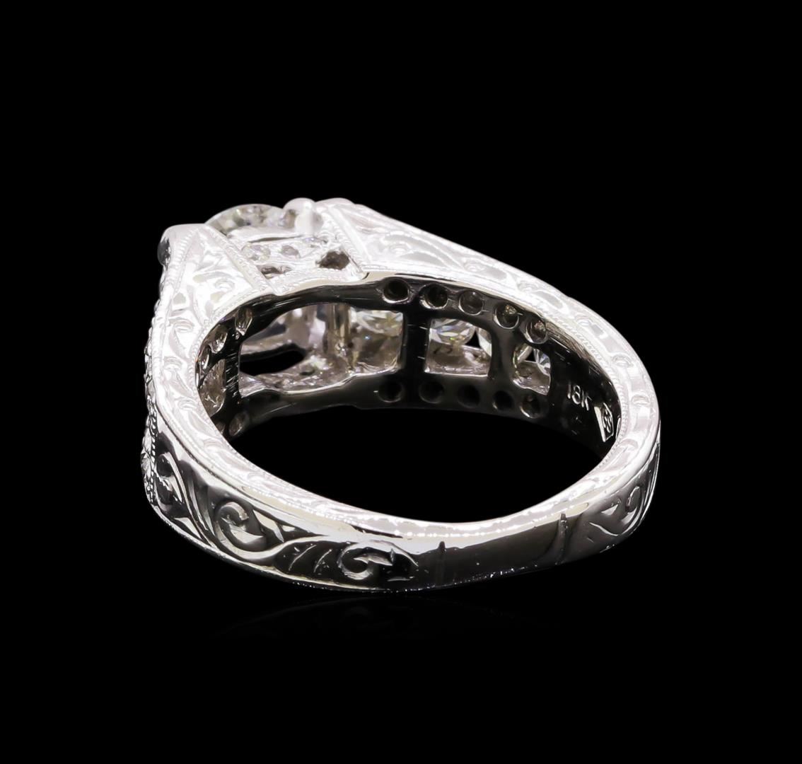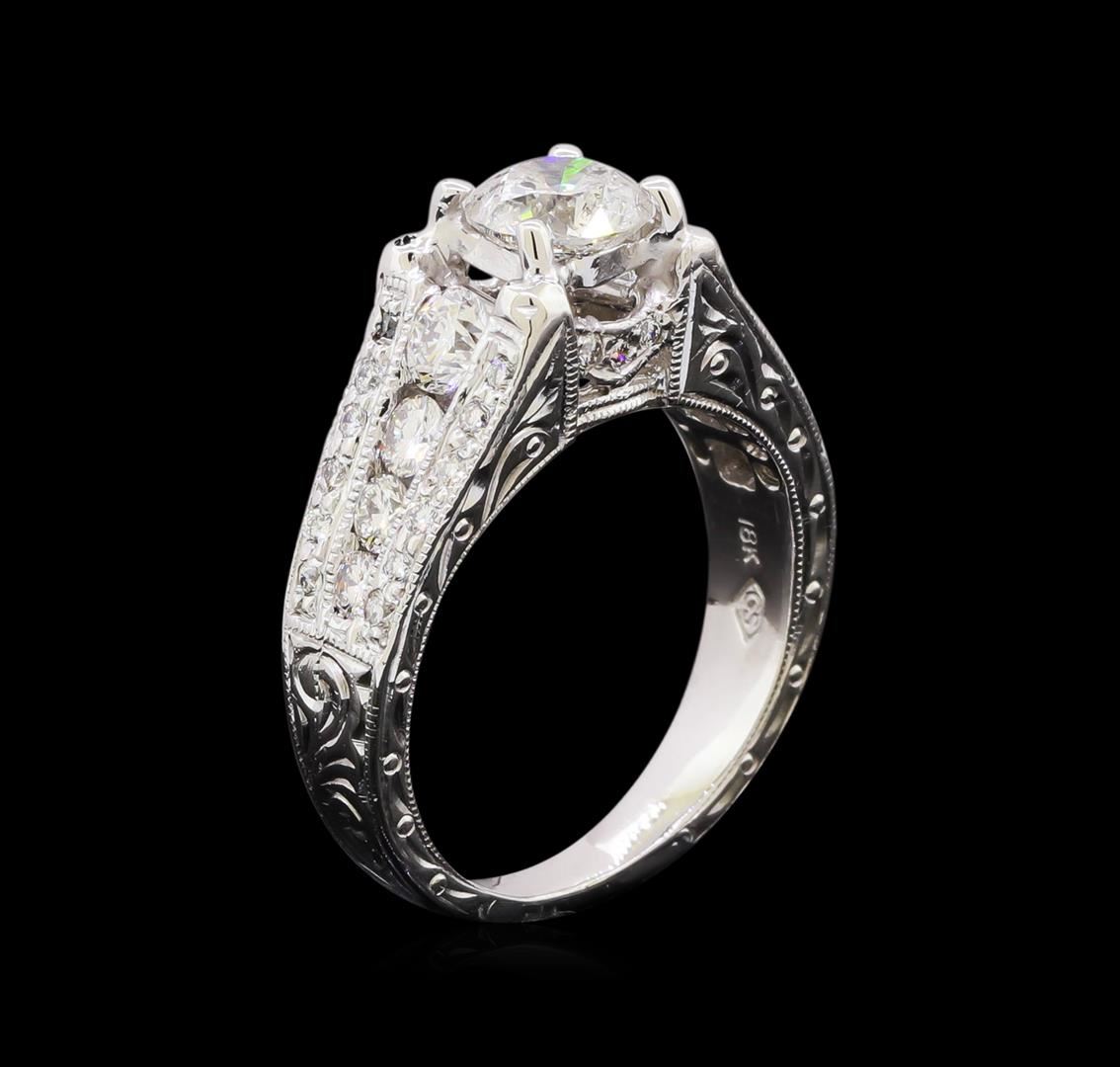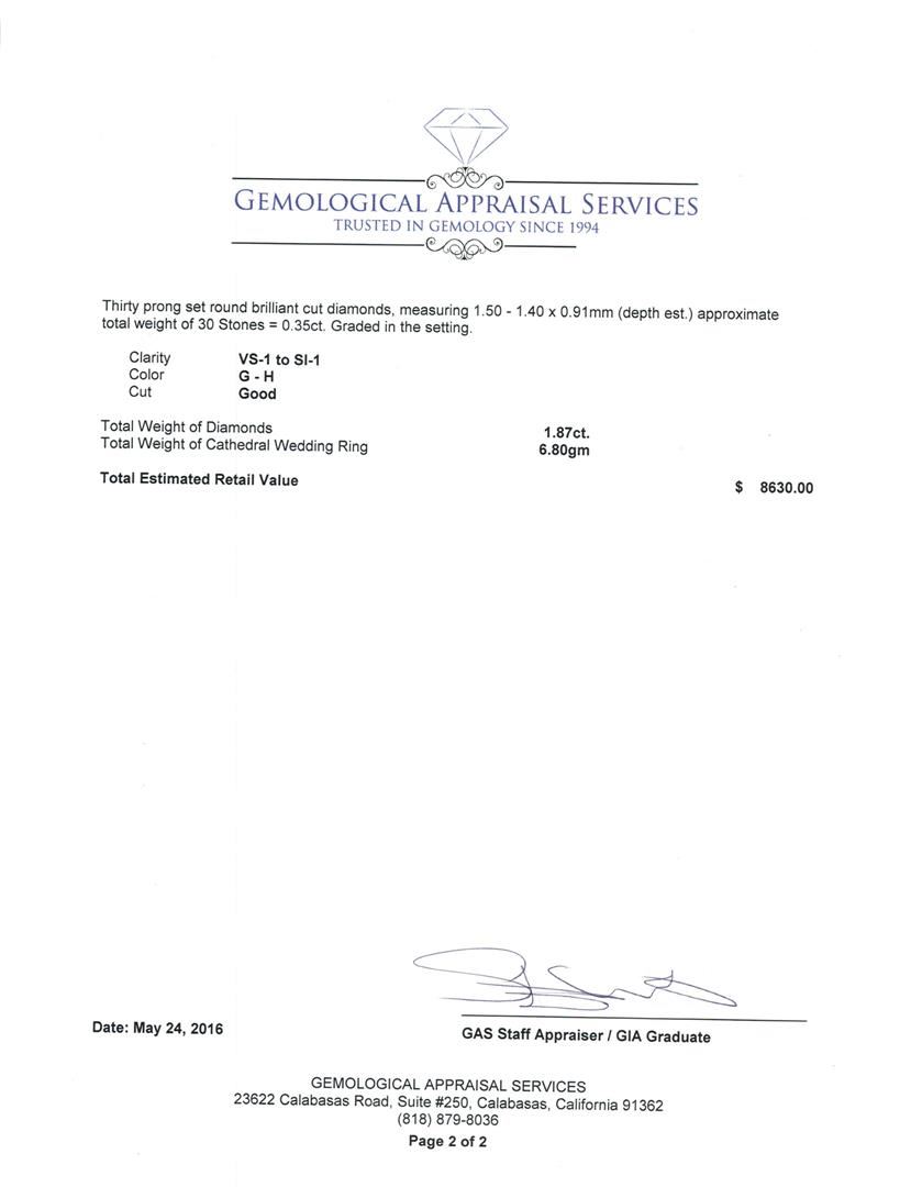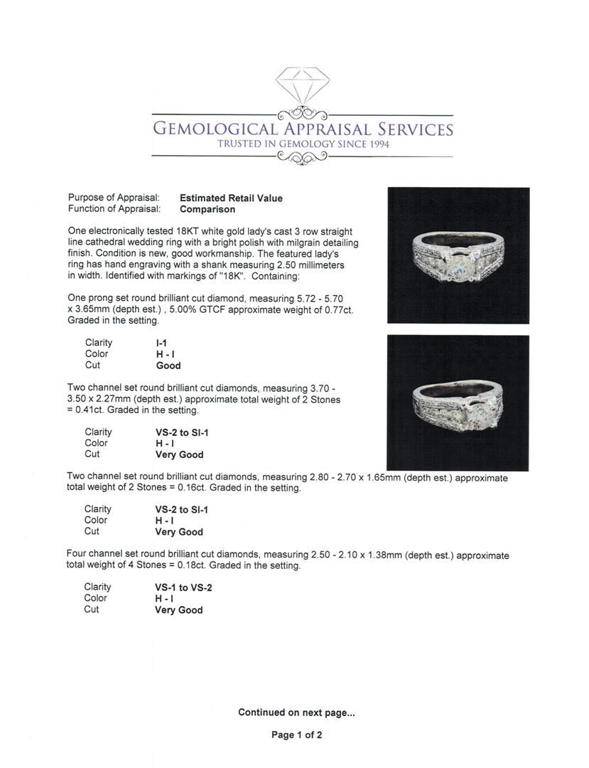 One electronically tested 18KT white gold lady's cast 3 row straight line cathedral wedding ring with a bright polish with milgrain detailing finish. The featured lady's ring has hand engraving with a shank measuring 2.50 millimeters in width. Identified with markings of "18K". Condition is new, good workmanship. Containing: One prong set round brilliant cut diamond, measuring 5.72 - 5.70 x 3.65mm (depth est.) , 5.00.%. GTCF approximate weight of 0.77ct. Graded in the setting. Clarity: I-1. Color: H - I. Cut Good Two channel set round brilliant cut diamonds, measuring 3.70 - 3.50 x 2.27mm (depth est.) approximate total weight of 2 Stones = 0.41ct. Graded in the setting. Clarity: VS-2 to SI-1. Color: H - I. Cut Very Good Two channel set round brilliant cut diamonds, measuring 2.80 - 2.70 x 1.65mm (depth est.) approximate total weight of 2 Stones = 0.16ct. Graded in the setting. Clarity: VS-2 to SI-1. Color: H - I. Cut Very Good Four channel set round brilliant cut diamonds, measuring 2.50 - 2.10 x 1.38mm (depth est.) approximate total weight of 4 Stones = 0.18ct. Graded in the setting. Clarity: VS-1 to VS-2. Color: H - I. Cut Very Good Thirty prong set round brilliant cut diamonds, measuring 1.50 - 1.40 x 0.91mm (depth est.) approximate total weight of 30 Stones = 0.35ct. Graded in the setting. Clarity: VS-1 to SI-1. Color: G - Good. Total Weight of Diamonds 1.87ct. Total Weight of Cathedral Wedding Ring 6.80gm. GAS Appraised at $8,630.00.