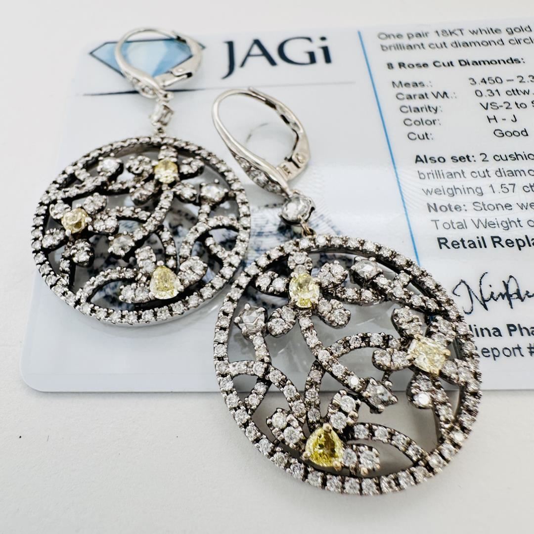 These charming 18K white gold round brilliant cut diamond circle floral earrings feature 8 rose cut diamonds measuring 3.450 - 2.300 mm, weighing 0.31 cttw, with VS-2 to SI-2 clarity and H-J color, exhibiting a Good cut. Also set are 2 cushion, 2 oval, 2 pear, and 212 round brilliant cut diamonds weighing 1.57 cttw, with SI1-I2 clarity and H-J & O-W color. The total item weight is 13.300 gm.