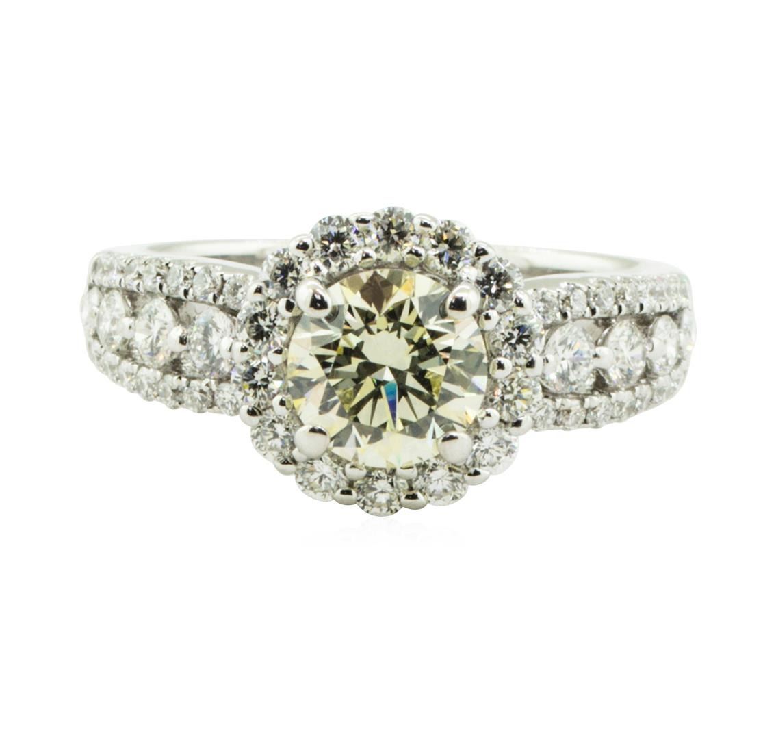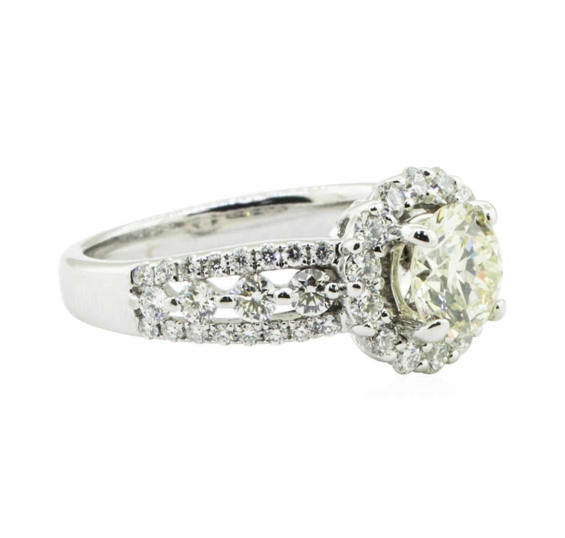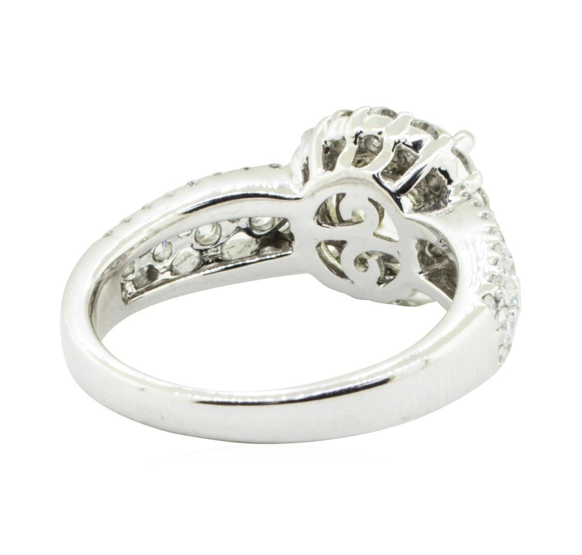 One electronically tested 18KT white gold lady's combination cast & assembled fashion halo engagement ring with a three row cathedral shank with a bright polish finish. The featured lady's ring has a shank measuring 2.40 millimeters in width. Condition is