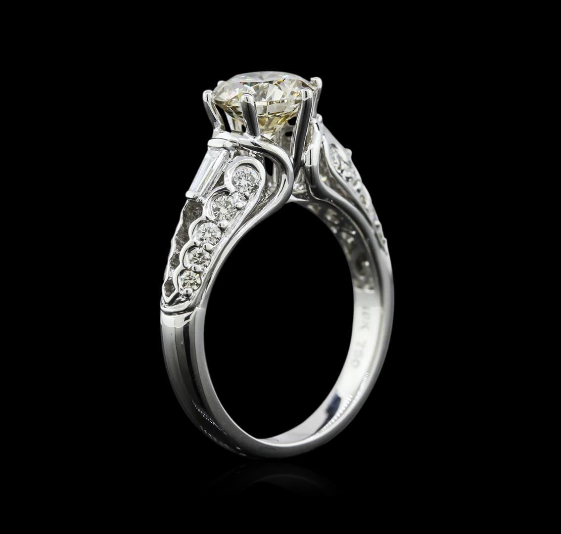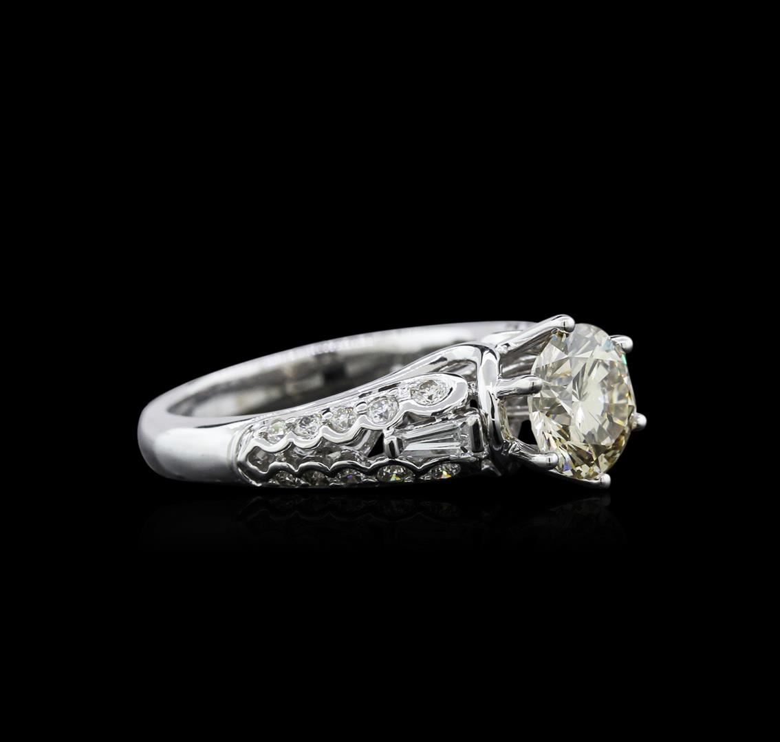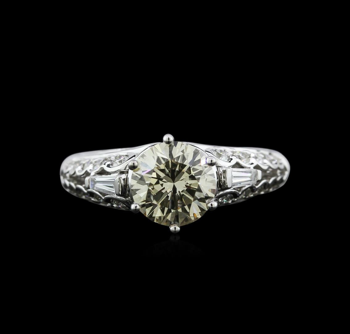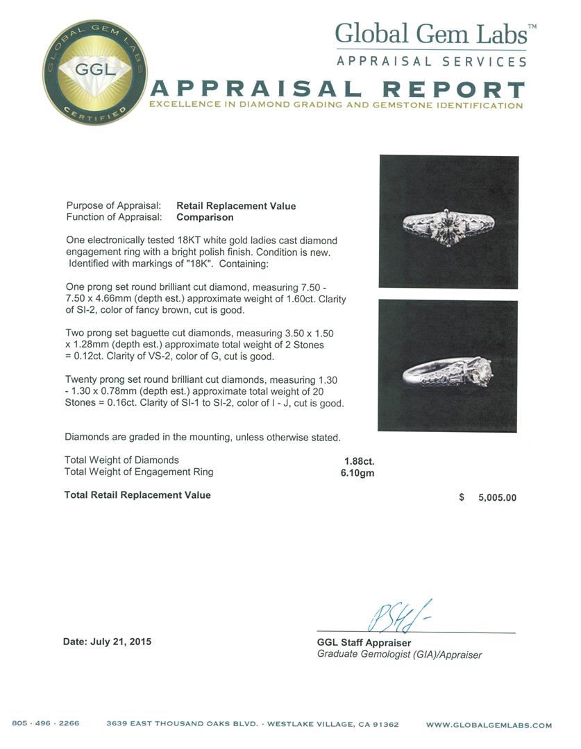 One electronically tested 18KT white gold ladies cast diamond engagement ring with a bright polish finish. Identified with markings of "18K". Condition is new. Containing: One prong set round brilliant cut diamond, measuring 7.50 - 7.50 x 4.66mm (depth est.) approximate weight of 1.60ct. Clarity: SI-2, color of fancy brown, cut is Good. Two prong set baguette cut diamonds, measuring 3.50 x 1.50 x 1.28mm (depth est.) approximate total weight of 2 Stones = 0.12ct. Clarity: VS-2. Color: G, Cut is Good. Twenty prong set round brilliant cut diamonds, measuring 1.30 - 1.30 x 0.78mm (depth est.) approximate total weight of 20 Stones = 0.16ct. Clarity: SI-1 to SI-2. Color: I - J, Cut is Good. Diamonds are graded in the mounting, unless otherwise stated. Total Weight of Diamonds 1.88ct. Total Weight of Engagement Ring 6.10gm. GGL Appraised at $5,005.00.