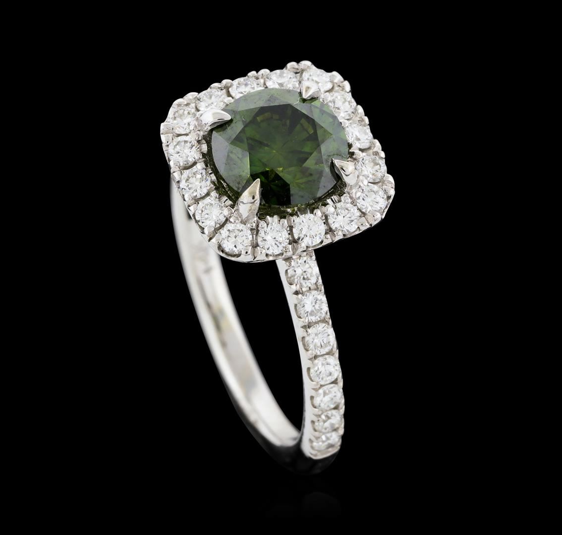 One electronically tested 14KT white gold lady's cast fashion ring with a cushion halo with a bright polish finish. The featured lady's ring has a shank measuring 1.87 millimeters wide. Identified with markings of '14K'. Condition is new, good workmanship. Containing: One prong set round brilliant cut diamond, measuring 6.90 - 6.88 x 4.34mm (depth est.) , 5.00.%. GTCF approximate weight of 1.32ct. Colored gemstones are presumed to have been subjected to commonly used enhancement processes. Graded in the setting. Clarity SI-1 Cut Very Good Thirty-Two prong set round brilliant cut diamonds, measuring 1.70 - 1.60 x 1.02mm (depth est.) approximate total weight of 32 Stones = 0.56ct. Graded in the setting. Clarity VS-2 to SI-1. Color: G - H Cut Very Good. Total Weight of Diamonds 1.88ct.. Total Weight of Ring 3.30gm. GAS Appraised at $13,225.00.