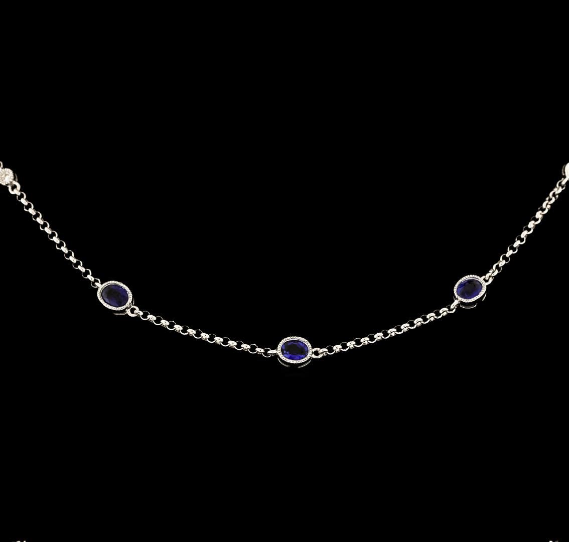 One electronically tested 18KT white gold lady's combination cast & assembled diamonds by the yard necklace with a lobster claw clasp with a bright polish with milgrain detailing finish. The featured lady's necklace has a 1.60mm thick rolo chain that can be worn between sixteen and approximately seventeen and a half inches in length. Identified with markings of '18K 750'. Condition is new, good workmanship. Containing: Nine bezel set oval modified mixed cut natural blue sapphires, measuring 4.10 x 3.10 x 1.95mm, (depth est.) approximate total weight of 1.88ct., clarity is slightly included, medium, moderately strong, blue color, (GIA B 5/4), cut is good. Transmitting light with a minimum distortion, transparent. Colored gemstones are presumed to have been subjected to commonly used enhancement processes. Graded in the setting. Four bezel set single cut diamonds, measuring 1.65 - 1.55 x 0.96mm (depth est.) approximate total weight of 4 Stones = 0.06ct. Graded in the setting. Clarity SI-1 to SI-2. Color: H - I Cut Good. Total Weight of Colored Stones 1.88ct.. Total Weight of Diamonds 0.06ct.. Total Weight of Necklace 6.20gm. GAS Appraised at $2,770.00.