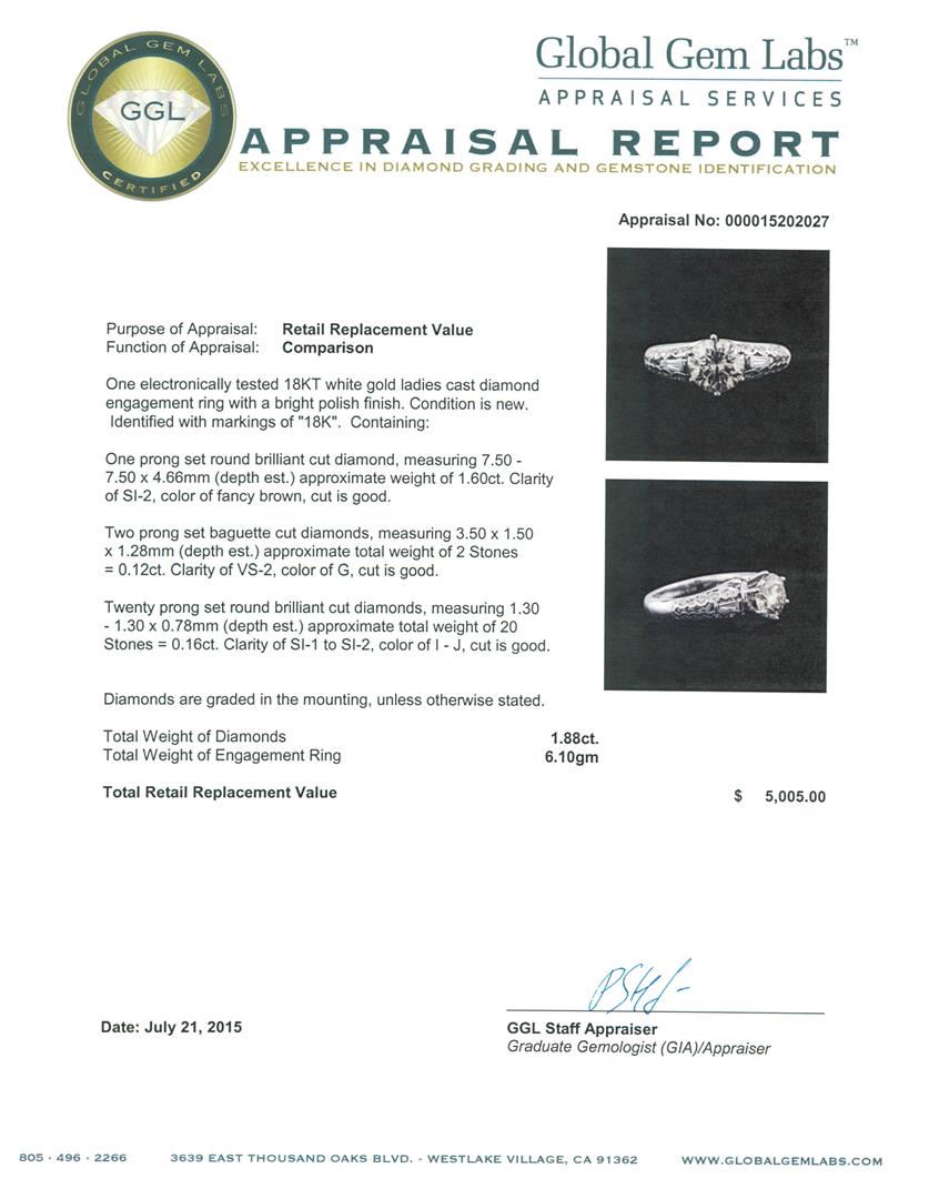 One electronically tested 18KT white gold ladies cast diamond engagement ring with a bright polish finish. Identified with markings of "18K". Condition is new. Containing: One prong set round brilliant cut diamond, measuring 7.50 - 7.50 x 4.66mm (depth es GGL Appraised at $5,005.00.