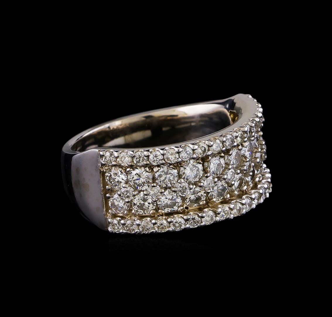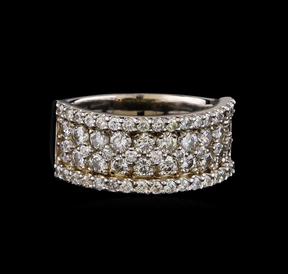 One electronically tested 14KT white gold lady's cast fashion ring with a four row wide band with a bright polish finish. The featured lady's ring has a shank measuring 4.27 millimeters in width. Identified with markings of "K14". Condition is new, good workmanship. Containing: Twenty prong set round brilliant cut diamonds, measuring 2.60 - 2.50 x 1.58mm (depth est.) approximate total weight of 20 Stones = 1.25ct. Graded in the setting. Clarity: SI-1 to SI-2. Color: H - I. Cut Good Forty-Three prong set round brilliant cut diamonds, measuring 1.60 - 1.55 x 0.98mm (depth est.) approximate total weight of 43 Stones = 0.64ct. Graded in the setting. Clarity: SI-1 to SI-2. Color: G - Good. Total Weight of Diamonds 1.89ct. Total Weight of Ring 8.60gm. GAS Appraised at $6,110.00.
