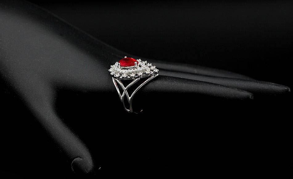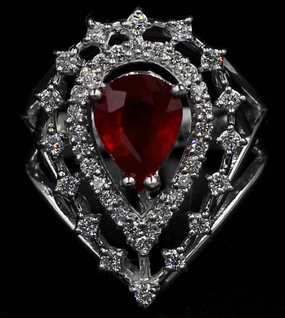 One anniversary band ring featuring: 14KT white gold weighing 6.67 grams containing one ruby weighing 1.89ct and 36 diamonds weighing 1.05ctw. The ruby is glass-filled and cut in a pear shape with fine clarity and red color with very good cut. The diamond