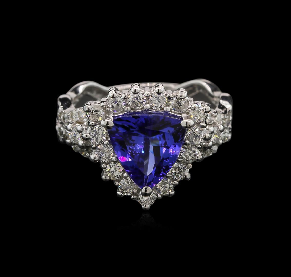 One electronically tested 14KT white gold ladies cast tanzanite and diamond ring with a bright polish finish. The featured tanzanite is set within a diamond bezel supported by elaborate diamond set shoulders, completed by a three millimeter wide band. Condition is new, good workmanship. Containing: One prong set triangle mixed cut natural tanzanite exact weight 1.89ct., clarity is slightly included, type I, dark, very slightly grayish, violetish blue color, (GIA vB 7/3), cut is good. Transmitting light with no distortion, transparent. Graded in the setting. Tanzanite is a very rare gemstone that is only found in the country of Tanzania. Originally discovered in 1967. Tiffany & Company, named the stone Tanzanite. It is found in the Usumburu Mountains that border the Umba Valley of northern Tanzania. Tanzanite occurs in gray, brown, violet, blue, reddish-purple, & green. The gem is interesting because of its exceptional pleochroism. Rotated in different directions a tanzanite will exhibit multiple changes of color. Tanzanite has a low tolerance to ultrasonic cleaning, and should not be cleaned using this method. Forty-One prong set round brilliant cut diamonds exact total weight 41 Stones = 0.82ct. Graded in the setting. Clarity: SI-2 to I-1. Color: G - I. Total Weight of Colored Stones 1.89ct. Total Weight of Diamonds 0.82ct. Total Weight of Ring 5.30gm. AIG Appraised at $6,595.00.