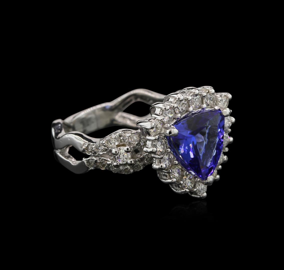 One electronically tested 14KT white gold ladies cast tanzanite and diamond ring with a bright polish finish. The featured tanzanite is set within a diamond bezel supported by elaborate diamond set shoulders, completed by a three millimeter wide band. Condition is new, good workmanship. Containing: One prong set triangle mixed cut natural tanzanite exact weight 1.89ct., clarity is slightly included, type I, dark, very slightly grayish, violetish blue color, (GIA vB 7/3), cut is good. Transmitting light with no distortion, transparent. Graded in the setting. Tanzanite is a very rare gemstone that is only found in the country of Tanzania. Originally discovered in 1967. Tiffany & Company, named the stone Tanzanite. It is found in the Usumburu Mountains that border the Umba Valley of northern Tanzania. Tanzanite occurs in gray, brown, violet, blue, reddish-purple, & green. The gem is interesting because of its exceptional pleochroism. Rotated in different directions a tanzanite will exhibit multiple changes of color. Tanzanite has a low tolerance to ultrasonic cleaning, and should not be cleaned using this method. Forty-One prong set round brilliant cut diamonds exact total weight 41 Stones = 0.82ct. Graded in the setting. Clarity: SI-2 to I-1. Color: G - I. Total Weight of Colored Stones 1.89ct. Total Weight of Diamonds 0.82ct. Total Weight of Ring 5.30gm. AIG Appraised at $6,595.00.
