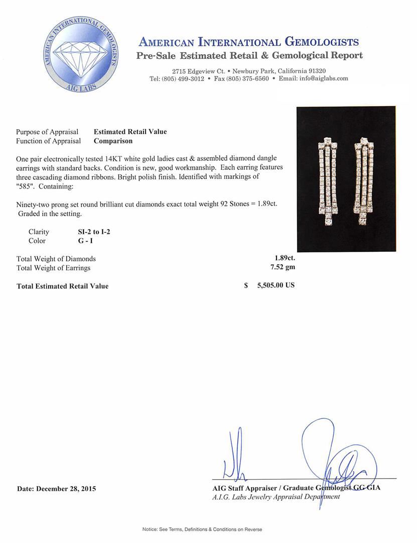 One pair electronically tested 14KT white gold ladies cast & assembled diamond dangle earrings with standard backs. Each earring features three cascading diamond ribbons. Bright polish finish. Identified with markings of "585". Condition is new, good workmanship. Containing: Ninety-Two prong set round brilliant cut diamonds exact total weight 92 Stones = 1.89ct. Graded in the setting. Clarity: SI-2 to I-2. Color: G - I. Total Weight of Diamonds 1.89ct. Total Weight of Earrings 7.52gm. AIG Appraised at $5,505.00.