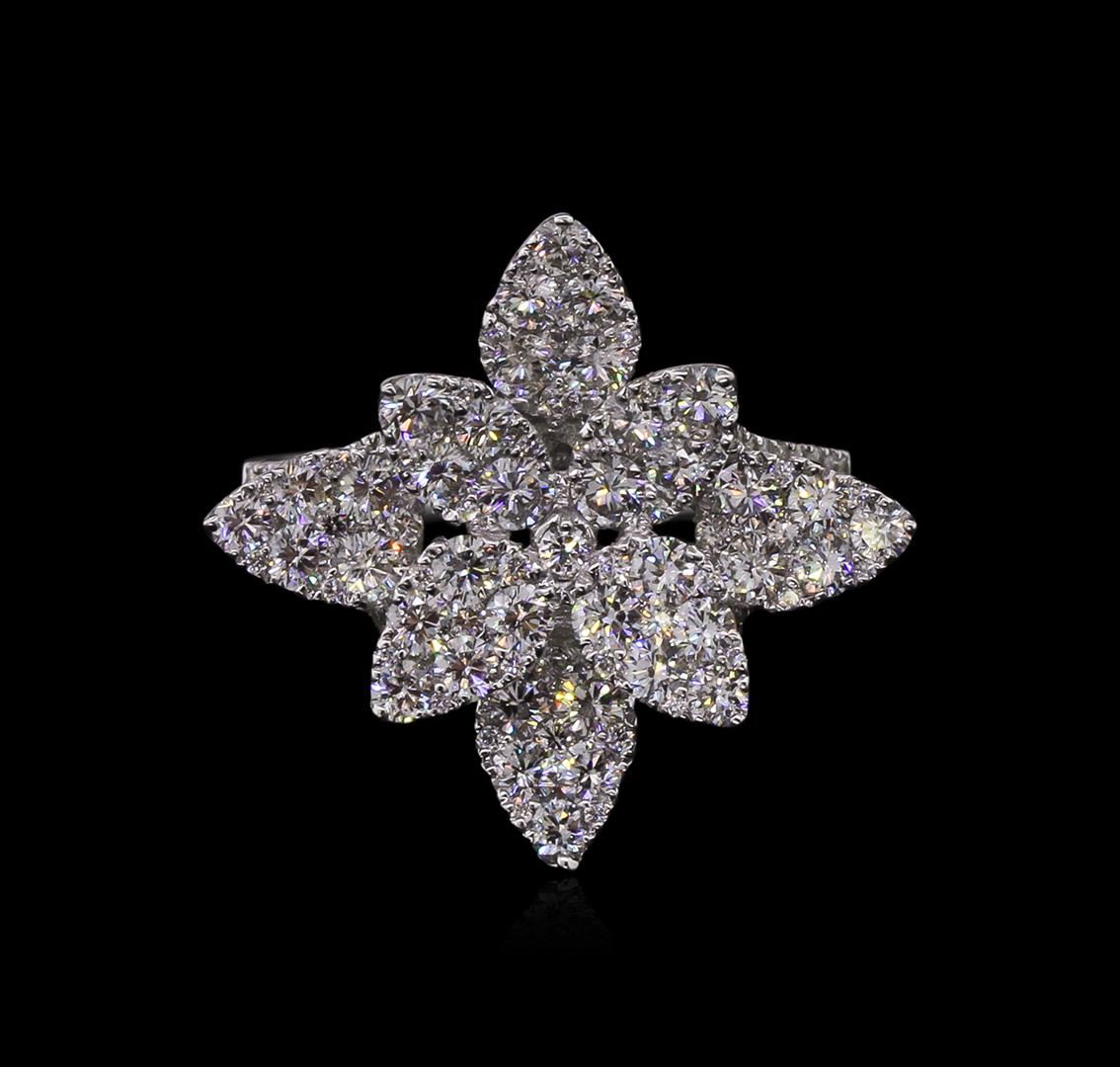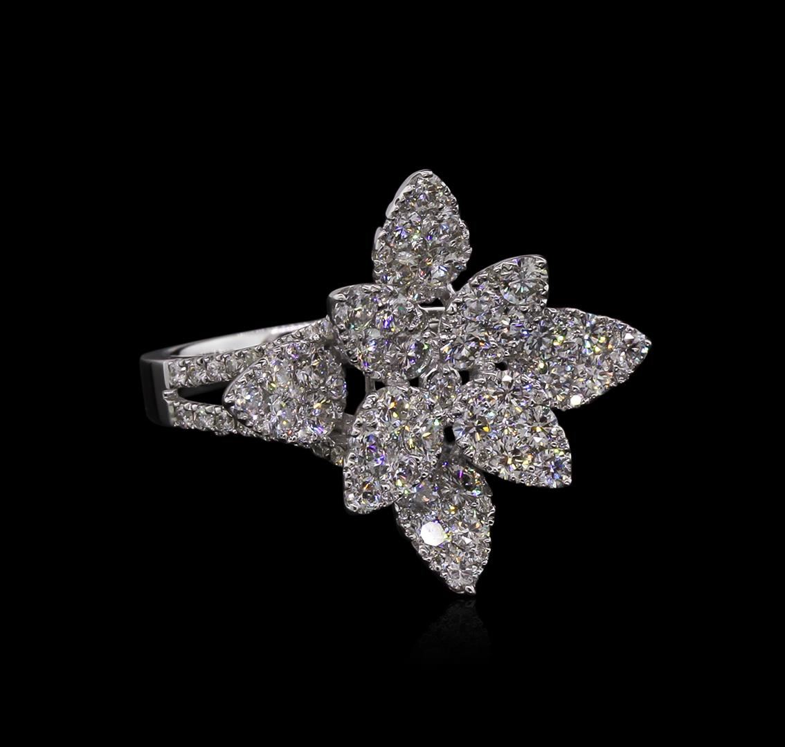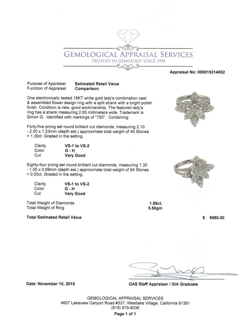 One electronically tested 18KT white gold lady's combination cast & assembled flower design ring with a split shank with a bright polish finish. The featured lady's ring has a shank measuring 2.65 millimeters wide. Trademark is Simon G. Identified with markings of "750". Condition is new, good workmanship. Containing: Forty-Five prong set round brilliant cut diamonds, measuring 2.10 - 2.00 x 1.23mm (depth est.) approximate total weight of 45 Stones = 1.39ct. Graded in the setting. Clarity: VS-1 to VS-2. Color: G - Very Good Eighty-Four prong set round brilliant cut diamonds, measuring 1.30 - 1.00 x 0.69mm (depth est.) approximate total weight of 84 Stones = 0.50ct. Graded in the setting. Clarity: VS-1 to VS-2. Color: G - Very Good. Total Weight of Diamonds 1.89ct. Total Weight of Ring 5.50gm. GAS Appraised at $9,580.00.
