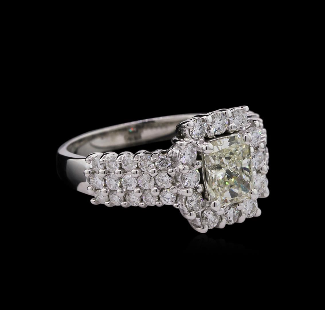 One electronically tested 14KT white gold lady's combination cast & assembled wedding ring with a basket halo with a bright polish finish. The featured lady's ring has a shank measuring 2.62 millimeters wide. Identified with markings of "14K". Condition is new, good workmanship. Containing: One prong set princess cut diamond, measuring 6.45 x 5.23 x 3.61mm (depth est.) approximate weight of 1.00ct. Graded in the setting. Clarity: I-1. Color: K - Very Good Thirty prong set round brilliant cut diamonds, measuring 1.60 - 1.55 x 1.03mm (depth est.) approximate total weight of 30 Stones = 0.48ct. Graded in the setting. Clarity: SI-1 to I-1. Color: G - I. Cut Good Twelve prong set round brilliant cut diamonds, measuring 2.10 - 2.05 x 1.33mm (depth est.) approximate total weight of 12 Stones = 0.42ct. Graded in the setting. Clarity: SI-1 to I-1. Color: G - I. Cut Good. Total Weight of Diamonds 1.90ct. Total Weight of Ring 5.30gm. GAS Appraised at $9,765.00.