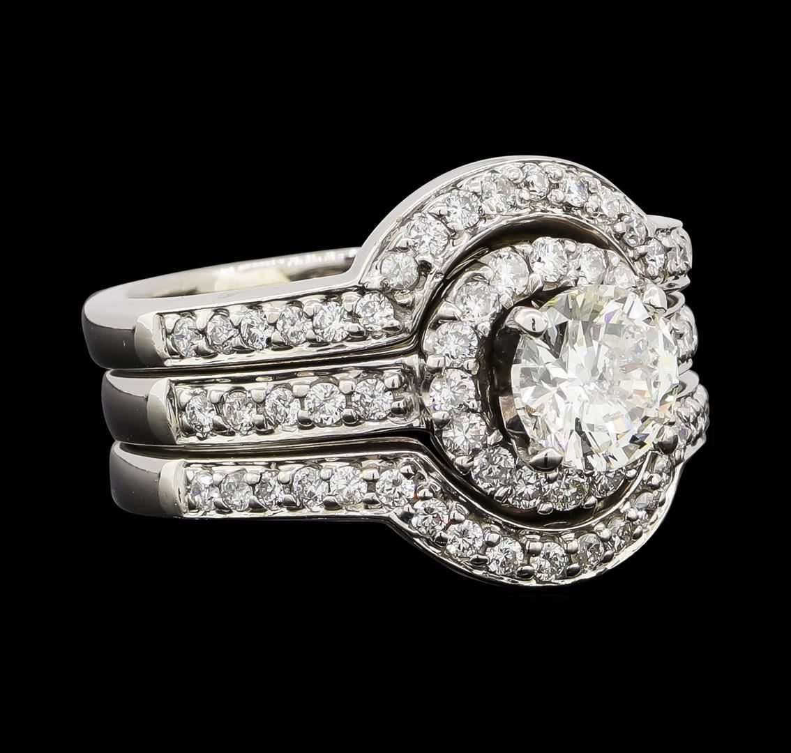 One electronically tested 18KT white gold lady's combination cast & assembled wedding ring soldered to wedding bands with a halo with a bright polish finish. The featured lady's wedding ring and bands have a triple shank measuring 6.69 millimeters wide. Identified with markings of '18K 750'. Condition is new, good workmanship. Containing: One prong set round brilliant cut diamond, measuring 6.19 - 6.17 x 4.20mm (depth est.) , 5.00.%. GTCF approximate weight of 1.03ct. Graded in the setting. Clarity I-1. Color: J Cut Good Sixteen prong set round brilliant cut diamonds, measuring 1.70 - 1.60 x 1.02mm (depth est.) approximate total weight of 16 Stones = 0.27ct. Graded in the setting. Clarity SI-1 to I-1. Color: H - I Cut Good Fifty prong set round brilliant cut diamonds, measuring 1.50 - 1.40 x 0.90mm (depth est.) approximate total weight of 50 Stones = 0.60ct. Graded in the setting. Clarity SI-1 to I-1. Color: H - I Cut Good. Total Weight of Diamonds 1.90ct.. Total Weight of Ring Soldered To Wedding Bands 10.70gm. GAS Appraised at $10,555.00.