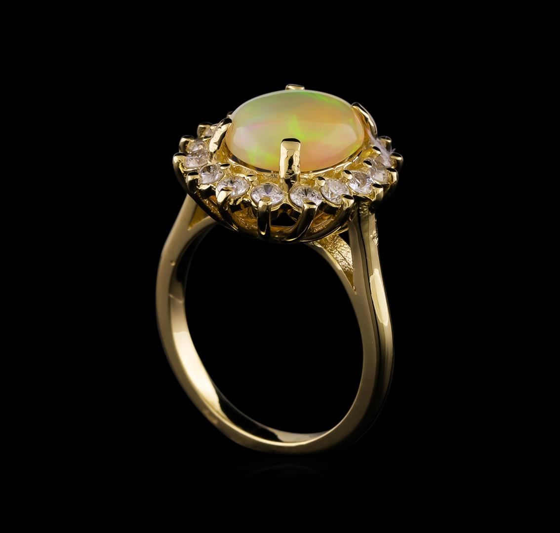 One ring : 14KT yellow gold weighing 5.37gm containing one opal center stone with a total weight of 1.90ct. and side diamonds weighing 0.75ctw.