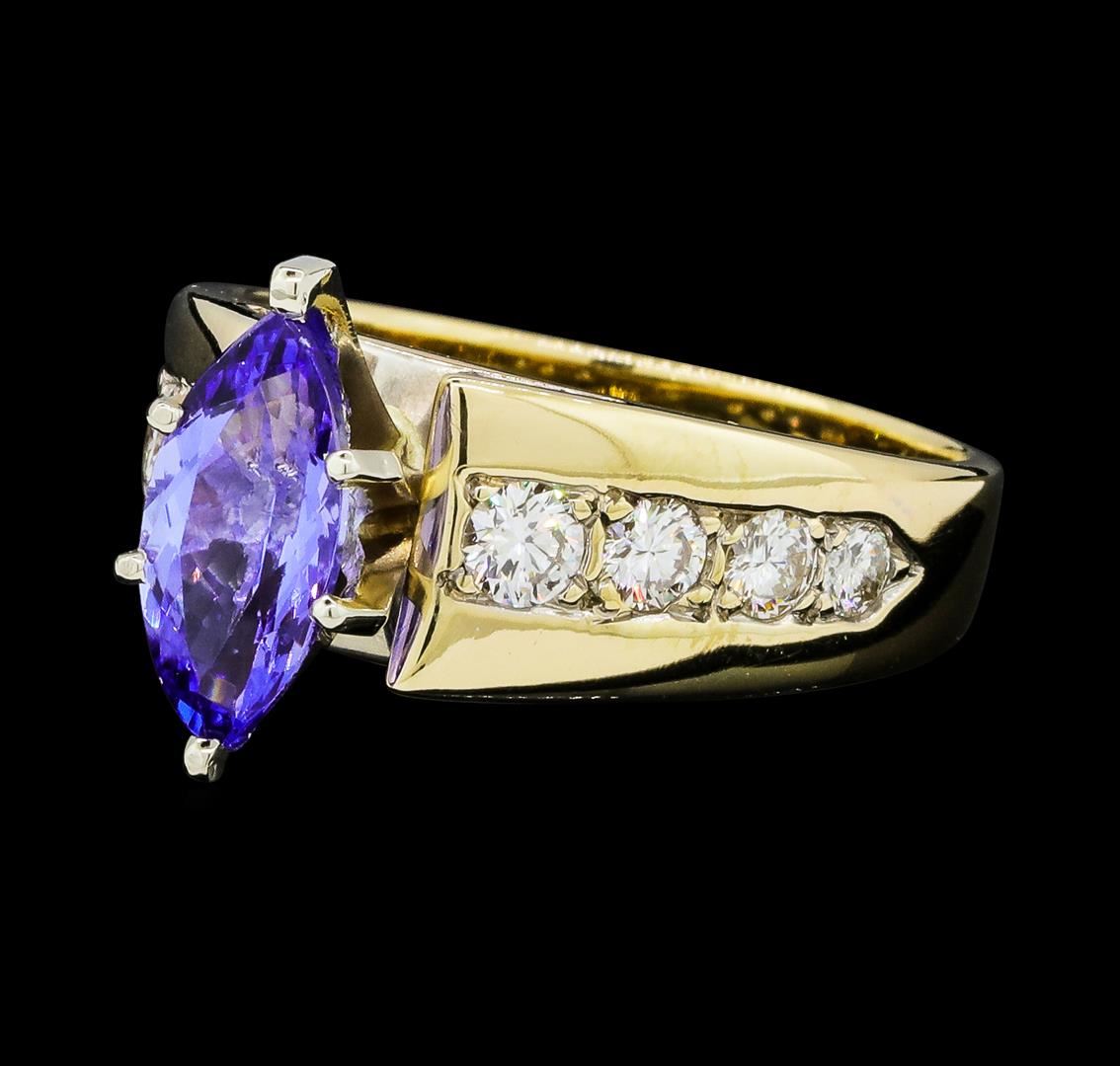 One electronically tested 14KT yellow gold lady's combination cast & assembled fashion ring with a tapered shank with a bright polish finish. The featured lady's ring has a shank measuring 3.68 millimeters wide. Identified with markings of '14K'. Condition is new, good workmanship. Containing: One prong set marquise modified brilliant cut natural tanzanite, measuring 11.95 x 5.90 x 3.84mm, (depth est.) 10%. bulge factor, approximate weight of 1.90ct., clarity is eye clean, medium, moderately strong, violetish blue color, (GIA vB 5/4), cut is very good. Transmitting light with no distortion, transparent. Colored gemstones are presumed to have been subjected to commonly used enhancement processes. Graded in the setting. Two prong set round brilliant cut diamonds, measuring 3.50 - 3.40 x 2.14mm (depth est.) approximate total weight of 2 Stones = 0.31ct. Graded in the setting. Color H - I Clarity VS-1 to VS-2 Cut Very Good Six prong set round brilliant cut diamonds, measuring 3.10 - 2.70 x 1.80mm (depth est.) approximate total weight of 6 Stones = 0.55ct. Graded in the setting. Color H - I Clarity VS-2 to SI-1 Cut Good. Total Weight of Colored Stones 1.90ct.. Total Weight of Diamonds 0.86ct.. Total Weight of Ring 9.20gm GAS Appraised at $5495.00. GAS Appraised at $5,495.00.