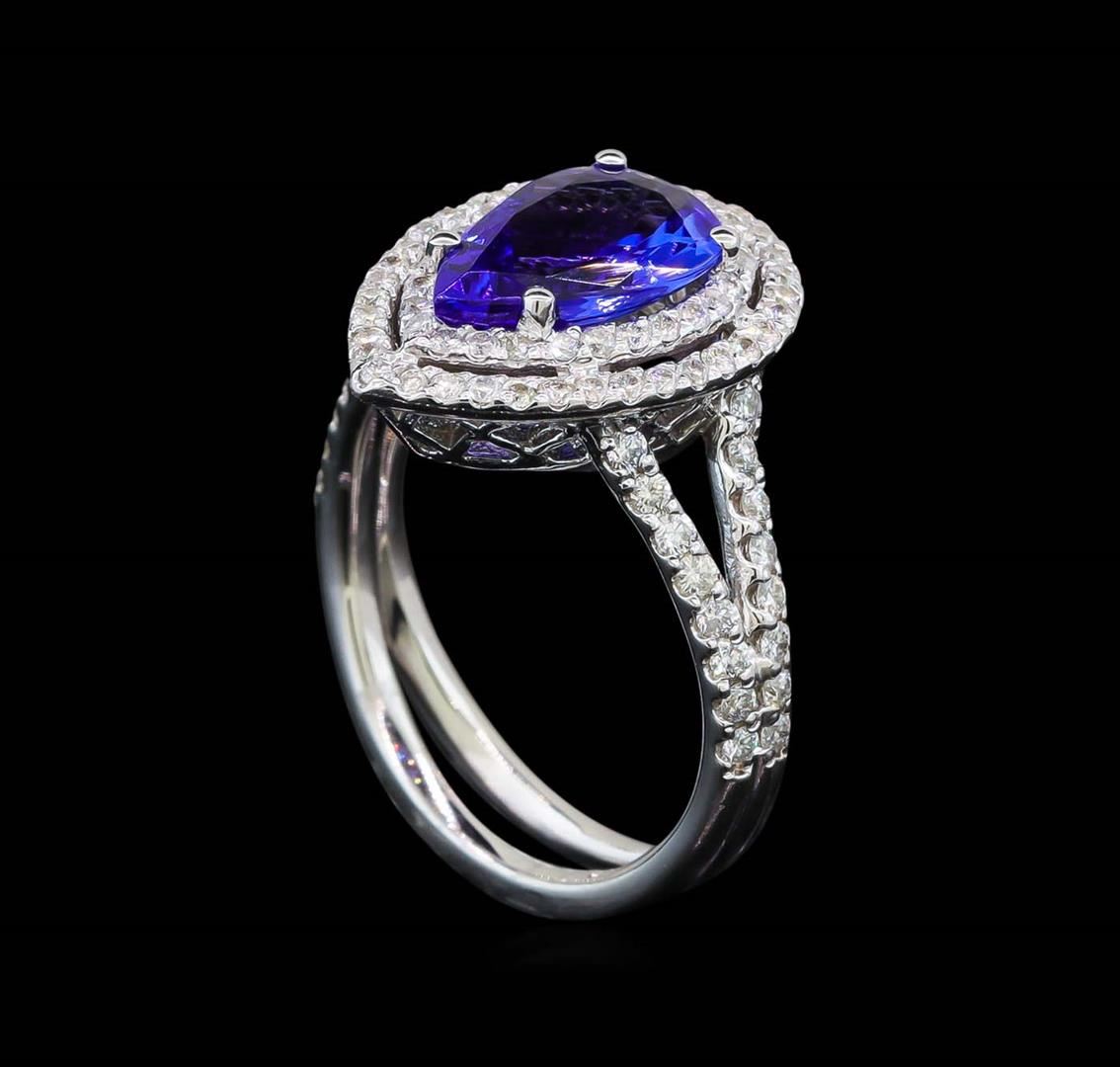 One electronically tested 14KT white gold lady's cast fashion ring with a split shank double basket halo with a bright polish finish. The featured lady's ring has a double shank measuring 4.70 millimeters wide. Identified with markings of '14K'. Condition is new, good workmanship. Containing: One prong set pear modified brilliant cut natural tanzanite, measuring 11.00 x 6.92 x 3.75mm, (depth est.) approximate weight of 1.90ct., clarity is eye clean, medium dark, moderately strong, violetish blue color, (GIA vB 6/4), cut is very good. Transmitting light with no distortion, transparent. Colored gemstones are presumed to have been subjected to commonly used enhancement processes. Graded in the setting. Thirty-Two prong set round brilliant cut diamonds, measuring 1.40 - 1.35 x 0.86mm (depth est.) approximate total weight of 32 Stones = 0.32ct. Graded in the setting. Clarity SI-1 to I-1. Color: H - I Cut Good Sixty-Two prong set round brilliant cut diamonds, measuring 1.20 - 1.15 x 0.73mm (depth est.) approximate total weight of 62 Stones = 0.38ct. Graded in the setting. Clarity SI-1 to SI-2. Color: H - I Cut Good. Total Weight of Colored Stones 1.90ct.. Total Weight of Diamonds 0.70ct.. Total Weight of Ring 5.60gm. GAS Appraised at $5,960.00.