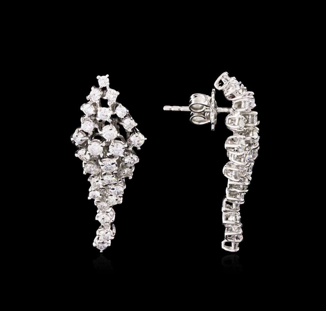 One pair electronically tested 14KT white gold lady's combination cast & assembled dangle earrings with medium friction backs with a bright polish finish. Identified with markings of "585". Condition is new, good workmanship. Containing: Fifty-Four prong set round brilliant cut diamonds, measuring 2.30 - 2.00 x 1.29mm (depth est.) approximate total weight of 54 Stones = 1.90ct. Graded in the setting. Clarity: SI-1 to I-1. Color: G - Good. Total Weight of Diamonds 1.90ct. Total Weight of Earrings 6.20gm. GAS Appraised at $5,640.00.