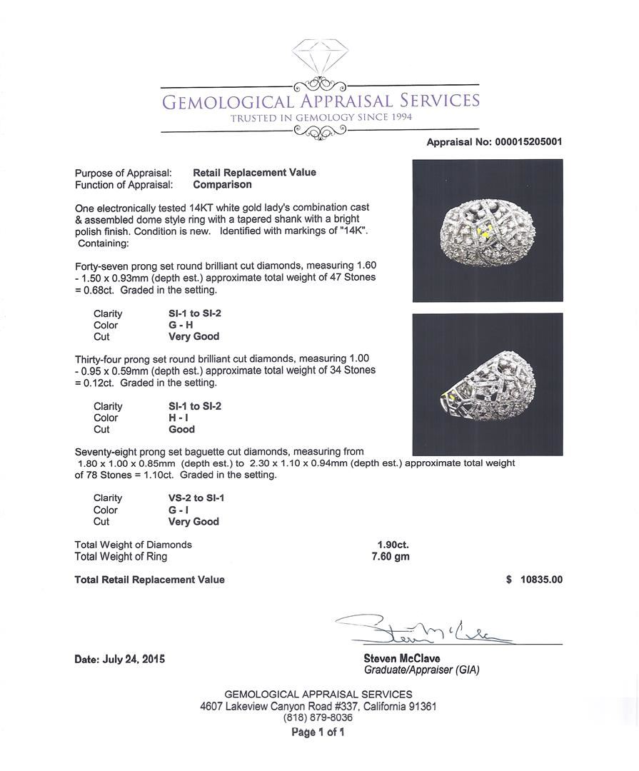 One electronically tested 14KT white gold lady's combination cast & assembled dome style ring with a tapered shank with a bright polish finish. Condition is new. Identified with markings of "14KT". Containing: Forty-seven prong set round brilliant cut diamonds, measuring 1.60 - 1.50 x 0.93mm (depth est.) approximate total weight of 47 Stones = 0.68ct. Graded in the setting. Clarity: SI-1 to SI-2. Color: H - I. Cut: Very Good. Thirty-four prong set round brilliant cut diamonds, measuring 1.00 - 0.95 x 0.59 (depth est.) approximate total weight of 34 Stones = 0.12ct. Graded in the setting. Clarity: VS-2 to SI-2. Color : H - I. Cut : Good. Seventy-eight prong set baguette cut diamonds, measuring from 1.80 x 1.00 x 0.85mm (depth est.) to 2.30 x 1.10 x 0.94 (depth est.) approximate total weight of 78 stones = 1.10ct. Graded in the setting. Clarity: VS-2 to SI-1. Color: G - I. Cut : Very Good. Total Weight of Diamonds : 1.90ct. Total Weight of Ring : 7.60 gm. Gemological Appraisal Services at $10,835.00.