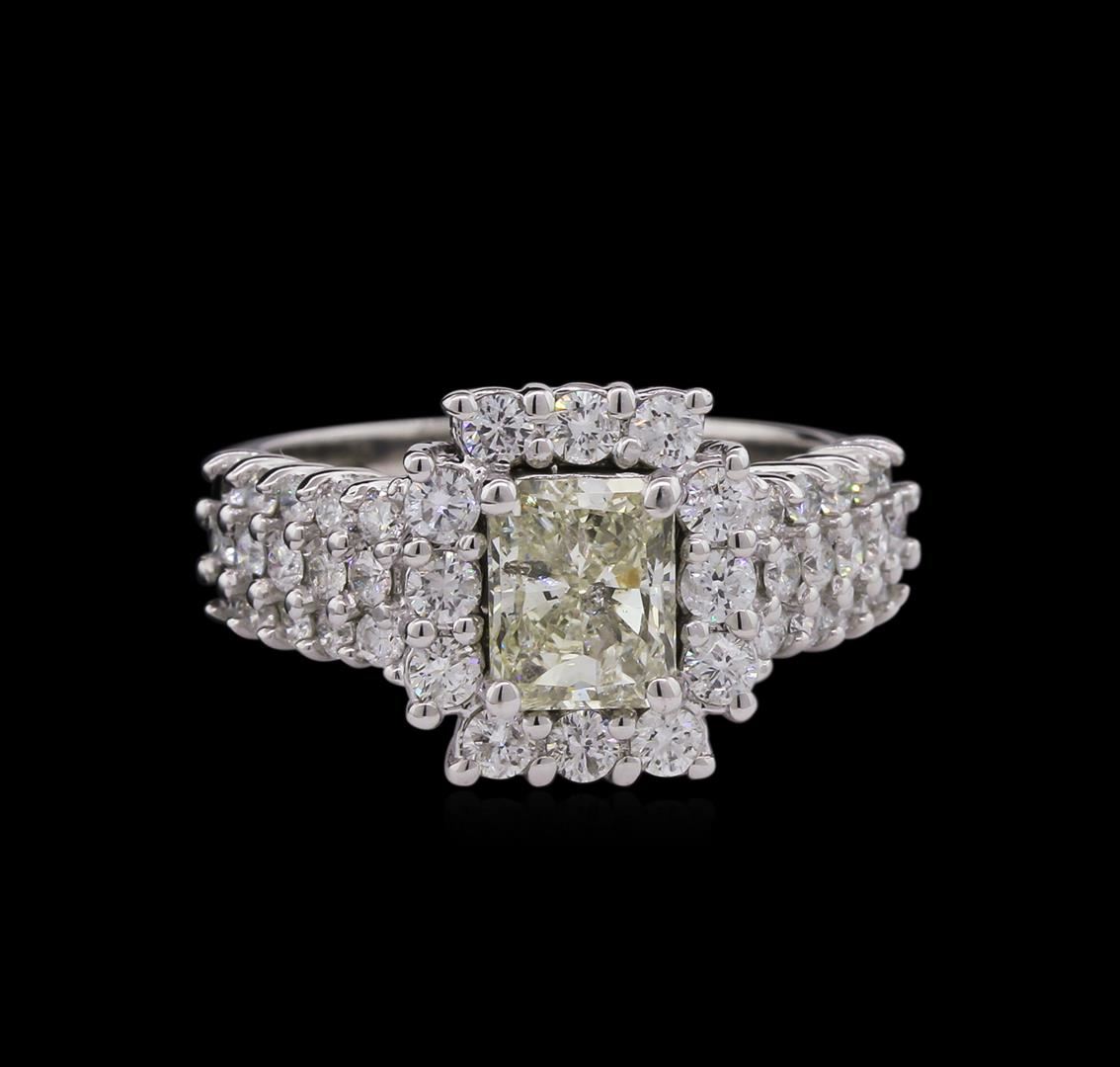One electronically tested 14KT white gold lady's combination cast & assembled wedding ring with a basket halo with a bright polish finish. The featured lady's ring has a shank measuring 2.62 millimeters wide. Identified with markings of "14K". Condition is new, good workmanship. Containing: One prong set princess cut diamond, measuring 6.45 x 5.23 x 3.61mm (depth est.) approximate weight of 1.00ct. Graded in the setting. Clarity: I-1. Color: K - Very Good Thirty prong set round brilliant cut diamonds, measuring 1.60 - 1.55 x 1.03mm (depth est.) approximate total weight of 30 Stones = 0.48ct. Graded in the setting. Clarity: SI-1 to I-1. Color: G - I. Cut Good Twelve prong set round brilliant cut diamonds, measuring 2.10 - 2.05 x 1.33mm (depth est.) approximate total weight of 12 Stones = 0.42ct. Graded in the setting. Clarity: SI-1 to I-1. Color: G - I. Cut Good. Total Weight of Diamonds 1.90ct. Total Weight of Ring 5.30gm. GAS Appraised at $9,765.00.