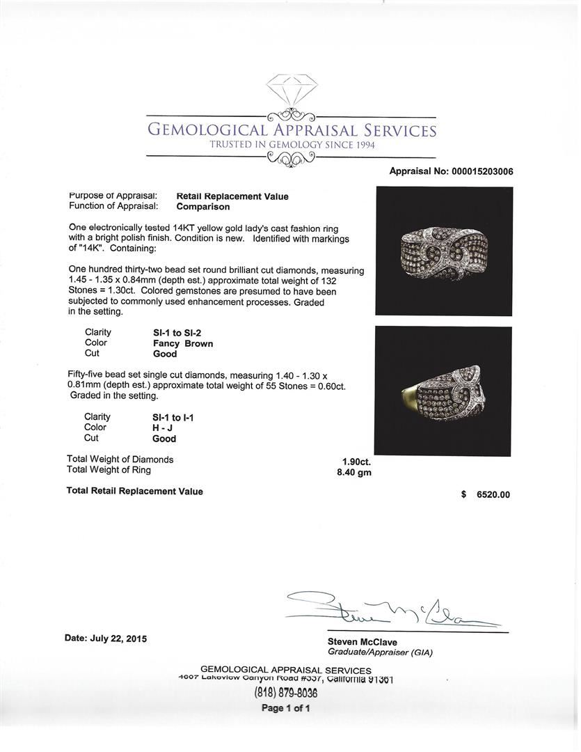 One electronically tested 14KT yellow gold lady's cast fashion ring with a bright polish finish. Condition is new. Identified with markings of "14K". Containing: One hundred thirty-two bead set round brilliant cut diamonds, measuring 1.45 - 1.35 x 0.84mm (depth est.) approximate total weight of 132 Stones = 1.30ct. Colored gemstones are presumed to have been subjected to commonly used enhancement processes. Graded in the setting. Clarity: SI-1 to SI-2. Color: Fancy Brown. Cut: Good. Fifty-five bead set single cut diamonds, measuring 1.40 - 1.30 x 0.81mm (depth est.) approximate total weight of 55 Stones = 0.60ct. Graded in the setting. Clarity: SI-1 to I-1. Color: H - J. Cut: Good. Total Weight of Diamonds: 1.90ct. Total Weight of Ring: 8.40 gm. GAS Appraised at $6,520.00.