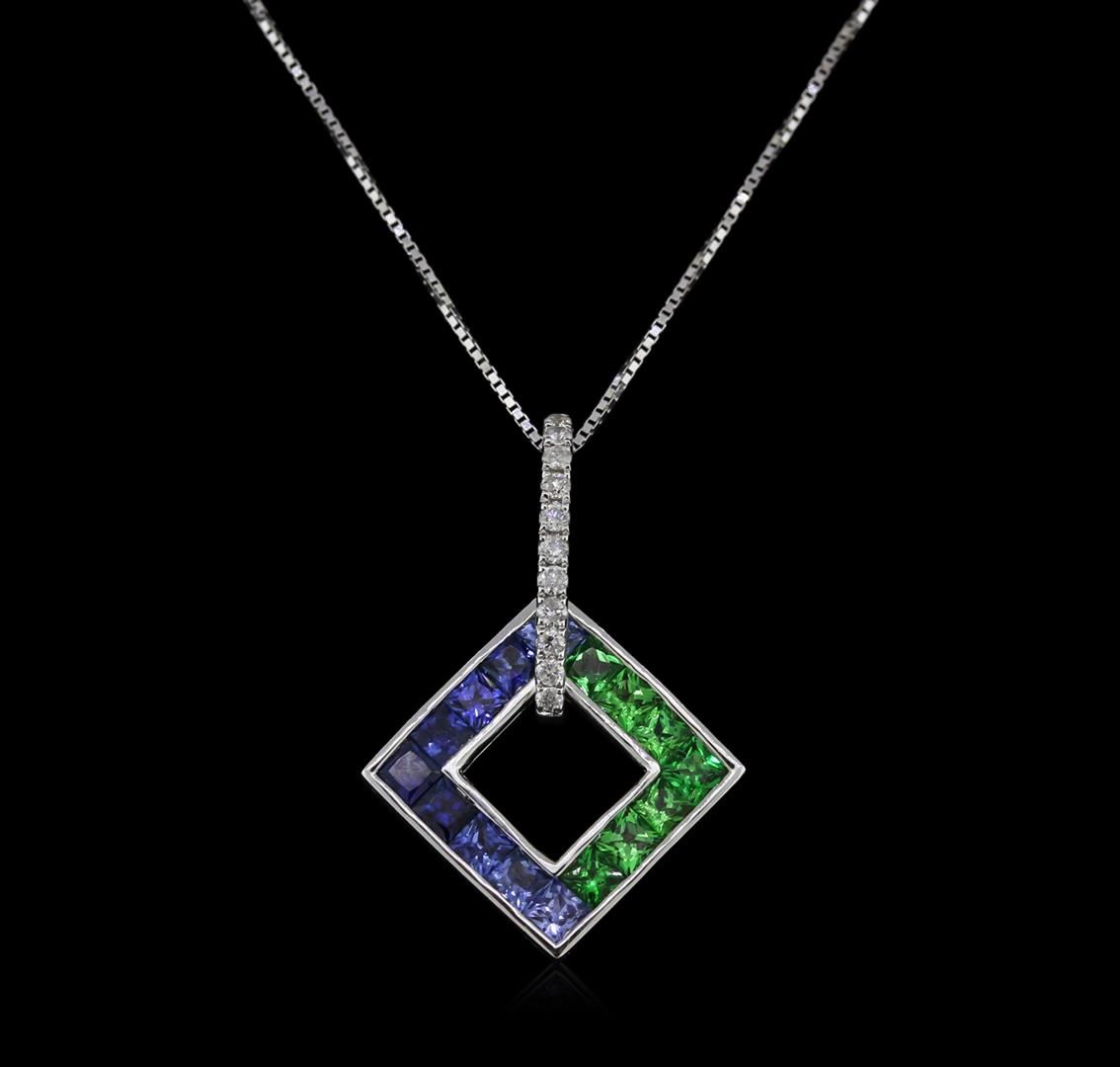 One pendant with chain featuring: 14KT white gold weighing 1.90 grams containing blue and green sapphires with a total weight of 1.90ct and diamonds with a total weight of 0.10ct.