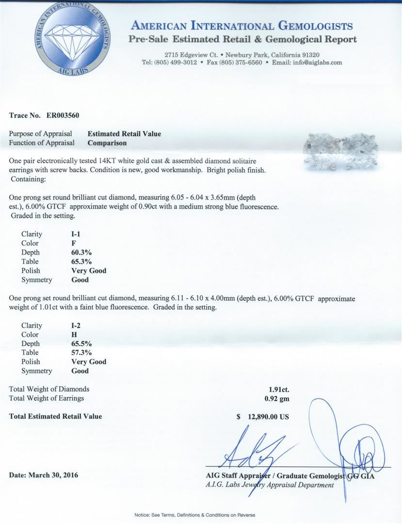 One pair electronically tested 14KT white gold cast & assembled diamond solitaire earrings with screw backs. Condition is new, good workmanship. Bright polish finish. Containing: One prong set round brilliant cut diamond, measuring 6.05 - 6.04 x 3.65mm (depth est.), 6.00% GTCF approximate weight of 0.90ct with a medium strong blue fluorescence. Graded in the setting. Clarity: I-1. Color: F. Depth: 60.3%. Table 65.3%. Polish: Very Good. Symmetry: Good. One prong set round brilliant cut diamond, measuring 6.11 - 6.10 x 4.00mm (depth est.), 6.00% GTCF approximate weight of 1.01ct with a faint blue fluorescence. Graded in the setting. Clarity: I-2. Color: H. Depth: 65.5%. Table: 57.3%. Polish: Very Good. Symmetry: Good. Total Weight of Diamonds 1.91ct. Total Weight of Earrings 0.92 grams. AIG Appraised at $12,890.00.