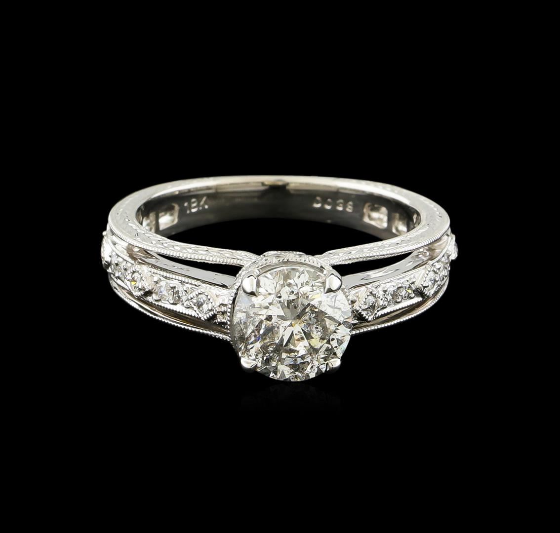 One electronically tested 18KT white gold ladies cast diamond unity ring. The featured diamond is supported by a diamond under gallery and elaborate diamond set three-way split shoulders, completed by a two and one-half millimeter wide band. Bright and engraved finish with milgrain detailing. Identified with markings of "18K". Condition is new, good workmanship. Containing: One prong set round brilliant cut diamond, measuring 7.23 - 7.18 x 4.58mm (depth est.), 5.00.%. GTCF approximate weight of 1.53ct with a faint blue fluorescence. Graded loose prior to setting in the GSI Laboratory, Report # 11096600210. Clarity: I-2. Color: G. Depth 63.5%. Table 69.0%. Two bezel set round brilliant cut diamonds, measuring 2.00 - 2.00 x 1.20mm (depth est.) approximate total weight of 2 Stones = 0.08ct. Graded in the setting. Clarity: SI-2. Color: G Thirty prong set round brilliant cut diamonds, measuring 1.35 - 1.30 x 0.80mm (depth est.) approximate total weight of 30 Stones = 0.30ct. Graded in the setting. Clarity: SI-1 to I-1. Color: F - H. Total Weight of Diamonds 1.91ct. Total Weight of Ring 5.72gm. AIG Appraised at $13,310.00.