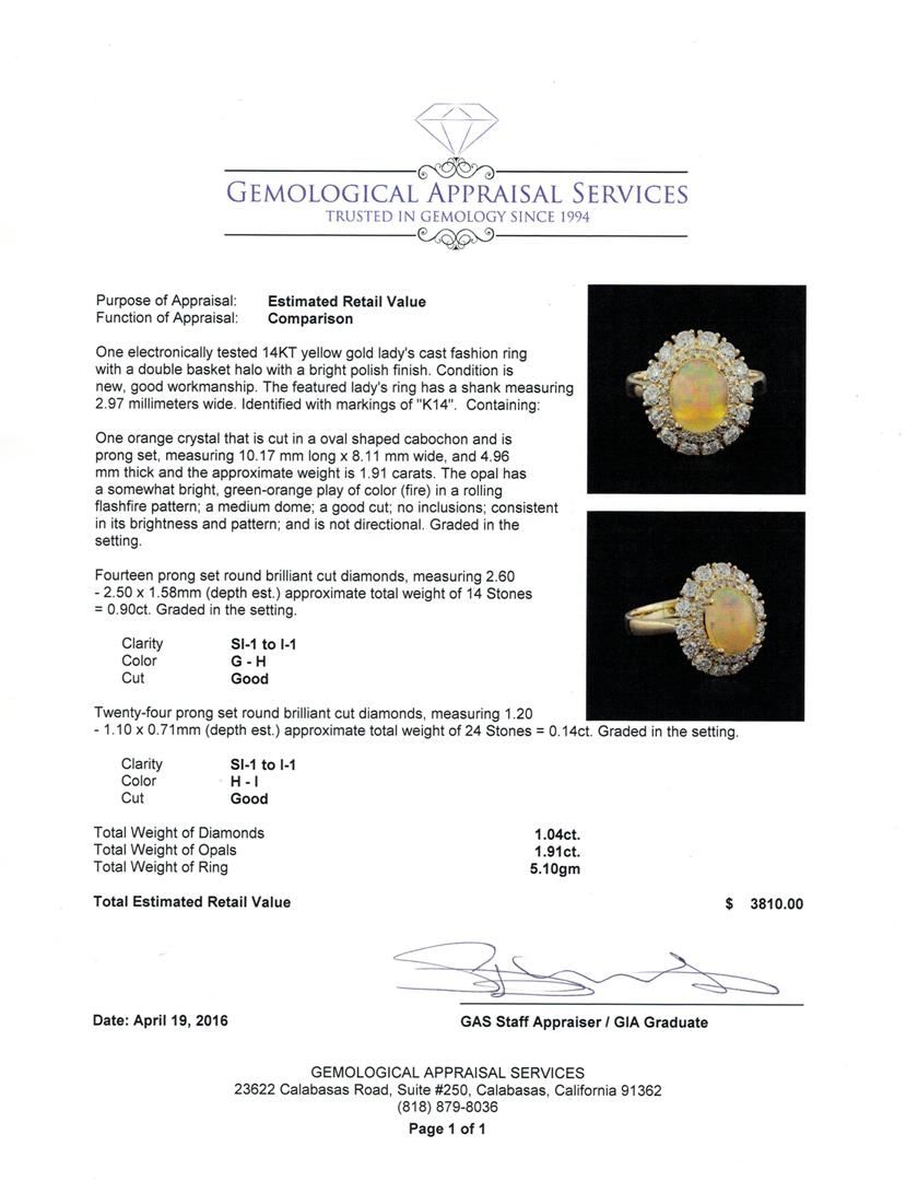 One electronically tested 14KT yellow gold lady's cast fashion ring with a double basket halo with a bright polish finish. The featured lady's ring has a shank measuring 2.97 millimeters wide. Identified with markings of "K14". Condition is new, good workmanship. Containing: One orange crystal that is cut in a oval shaped cabochon and is prong set, measuring 10.17 mm long x 8.11 mm wide, and 4.96 mm thick and the approximate weight is 1.91 carats. The opal has a somewhat bright, green-orange play of color (fire) in a rolling flashfire pattern; a medium dome; a good cut; no inclusions; consistent in its brightness and pattern; and is not directional. Graded in the setting. Fourteen prong set round brilliant cut diamonds, measuring 2.60 - 2.50 x 1.58mm (depth est.) approximate total weight of 14 Stones = 0.90ct. Graded in the setting. Clarity: SI-1 to I-1. Color: G - Good Twenty-Four prong set round brilliant cut diamonds, measuring 1.20 - 1.10 x 0.71mm (depth est.) approximate total weight of 24 Stones = 0.14ct. Graded in the setting. Clarity: SI-1 to I-1. Color: H - I. Cut Good. Total Weight of Diamonds 1.04ct. Total Weight of Opals 1.91ct. Total Weight of Ring 5.10gm. GAS Appraised at $3,810.00.