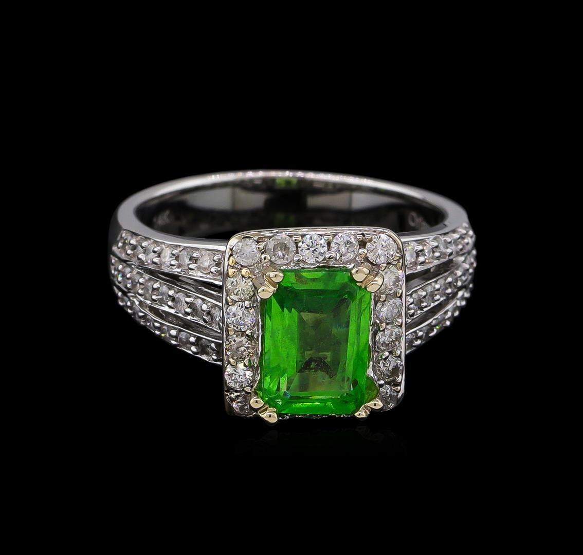One electronically tested 14KT white gold lady's cast fashion ring with a three row split shank halo with a bright polish finish. The featured lady's ring has a shank measuring 3.75 millimeters wide. Trademark is Orianne. Identified with markings of "14K". Condition is new, good workmanship. Containing: One prong set emerald step cut natural tsavorite garnet, measuring 8.46 x 5.92 x 3.85mm, approximate weight of 1.91ct., clarity is moderately included, type II, medium, moderately strong, slightly yellowish green color, (GIA slyG 5/4), cut is good. Transmitting light somewhat diffusely, transparent to translucent. Colored gemstones are presumed to have been subjected to commonly used enhancement processes. Graded in the setting. Eighteen prong set round brilliant cut diamonds, measuring 1.90 - 1.80 x 1.15mm (depth est.) approximate total weight of 18 Stones = 0.43ct. Graded in the setting. Clarity: SI-2 to I-2. Color: H - I. Cut Good Fifty-Four prong set round brilliant cut diamonds, measuring 1.20 - 1.10 x 0.72mm (depth est.) approximate total weight of 54 Stones = 0.31ct. Graded in the setting. Clarity: I-1 to I-2. Color: G - I. Cut Good. Total Weight of Colored Stones 1.91ct. Total Weight of Diamonds 0.74ct. Total Weight of Ring 6.70gm. GAS Appraised at $7,575.00.