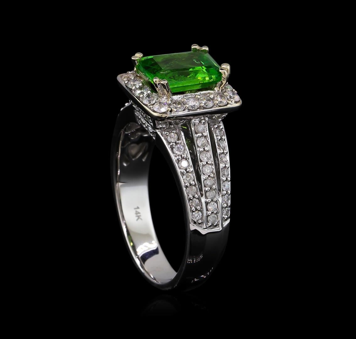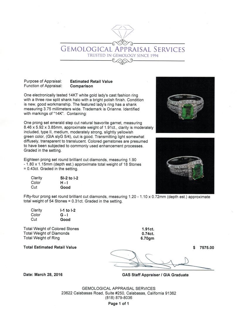 One electronically tested 14KT white gold lady's cast fashion ring with a three row split shank halo with a bright polish finish. The featured lady's ring has a shank measuring 3.75 millimeters wide. Trademark is Orianne. Identified with markings of "14K". Condition is new, good workmanship. Containing: One prong set emerald step cut natural tsavorite garnet, measuring 8.46 x 5.92 x 3.85mm, approximate weight of 1.91ct., clarity is moderately included, type II, medium, moderately strong, slightly yellowish green color, (GIA slyG 5/4), cut is good. Transmitting light somewhat diffusely, transparent to translucent. Colored gemstones are presumed to have been subjected to commonly used enhancement processes. Graded in the setting. Eighteen prong set round brilliant cut diamonds, measuring 1.90 - 1.80 x 1.15mm (depth est.) approximate total weight of 18 Stones = 0.43ct. Graded in the setting. Clarity: SI-2 to I-2. Color: H - I. Cut Good Fifty-Four prong set round brilliant cut diamonds, measuring 1.20 - 1.10 x 0.72mm (depth est.) approximate total weight of 54 Stones = 0.31ct. Graded in the setting. Clarity: I-1 to I-2. Color: G - I. Cut Good. Total Weight of Colored Stones 1.91ct. Total Weight of Diamonds 0.74ct. Total Weight of Ring 6.70gm. GAS Appraised at $7,575.00.