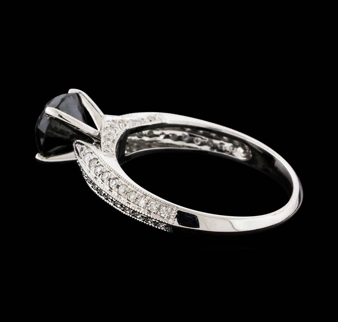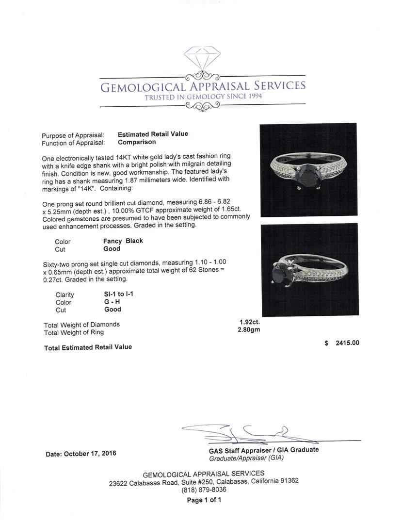 One electronically tested 14KT white gold lady's cast fashion ring with a knife edge shank with a bright polish with milgrain detailing finish. The featured lady's ring has a shank measuring 1.87 millimeters wide. Identified with markings of '14K'. Condition is new, good workmanship. Containing: One prong set round brilliant cut diamond, measuring 6.86 - 6.82 x 5.25mm (depth est.) , 10.00.%. GTCF approximate weight of 1.65ct. Colored gemstones are presumed to have been subjected to commonly used enhancement processes. Graded in the setting. Cut Good Sixty-Two prong set single cut diamonds, measuring 1.10 - 1.00 x 0.65mm (depth est.) approximate total weight of 62 Stones = 0.27ct. Graded in the setting. Clarity SI-1 to I-1. Color: G - H Cut Good. Total Weight of Diamonds 1.92ct.. Total Weight of Ring 2.80gm. GAS Appraised at $2,415.00.