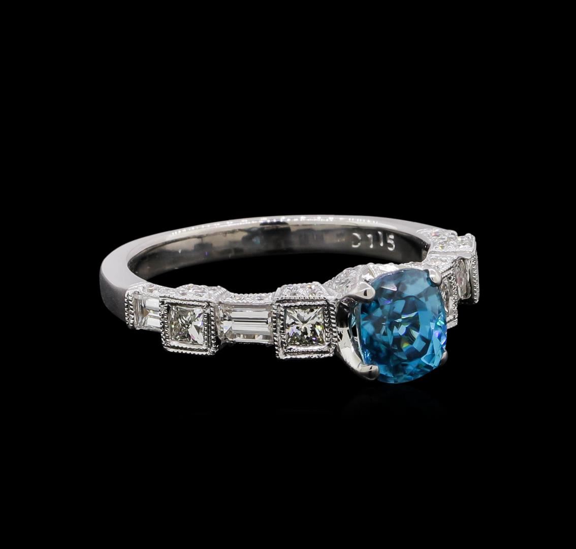 One electronically tested 18KT white gold ladies cast blue zircon and diamond ring. The featured blue zircon is supported by a diamond set under gallery and geometric style diamond set shoulders, completed by a two millimeter wide band. Bright polish finish with milgrain detailing. Identified with markings of '10K'. Condition is new, good workmanship. Containing: One prong set rectangular cushion mixed cut natural blue zircon, measuring 6.45 x 5.60 x 4.50mm, 7%. bulge factor, approximate weight of 1.92ct., clarity is eye clean, type I, medium dark, moderately strong, very strongly greenish blue color, (GIA vstgB 6/4), cut is good. Transmitting light with no distortion, transparent. Graded in the setting. Four bezel set princess cut diamonds, measuring 2.40 x 2.20 x 1.65mm (depth est.) approximate total weight of 4 Stones = 0.30ct. Graded in the setting. Clarity SI-1 to SI-2. Color: G - I Four channel set baguette cut diamonds, measuring from 2.50 x 2.00 x 1.40mm (depth est.) to 4.00 x 2.20 x 1.54mm (depth est.) approximate total weight of 4 Stones = 0.38ct. The clarity grade reflects the entire range of clarity for this group. Graded in the setting. Clarity VS-1 to SI-2. Color: F - H Sixty-Six prong set round brilliant cut diamonds, measuring 1.05 - 1.00 x 0.62mm (depth est.) approximate total weight of 66 Stones = 0.30ct. Graded in the setting. Clarity VS-2 to SI-1. Color: F - H. Total Weight of Colored Stones 1.92ct.. Total Weight of Diamonds 0.98ct.. Total Weight of Ring 4.12gm. AIG Appraised at $5,180.00.