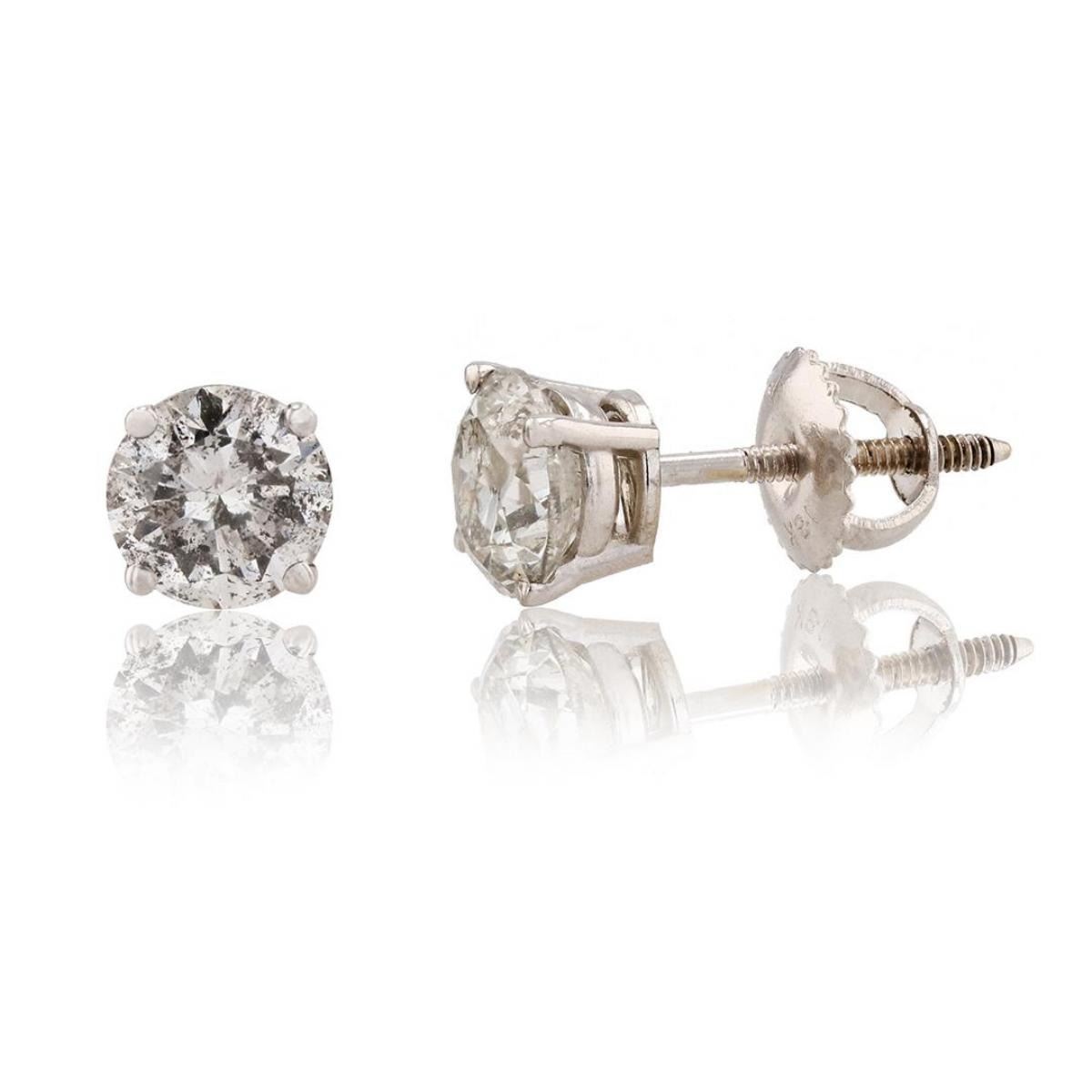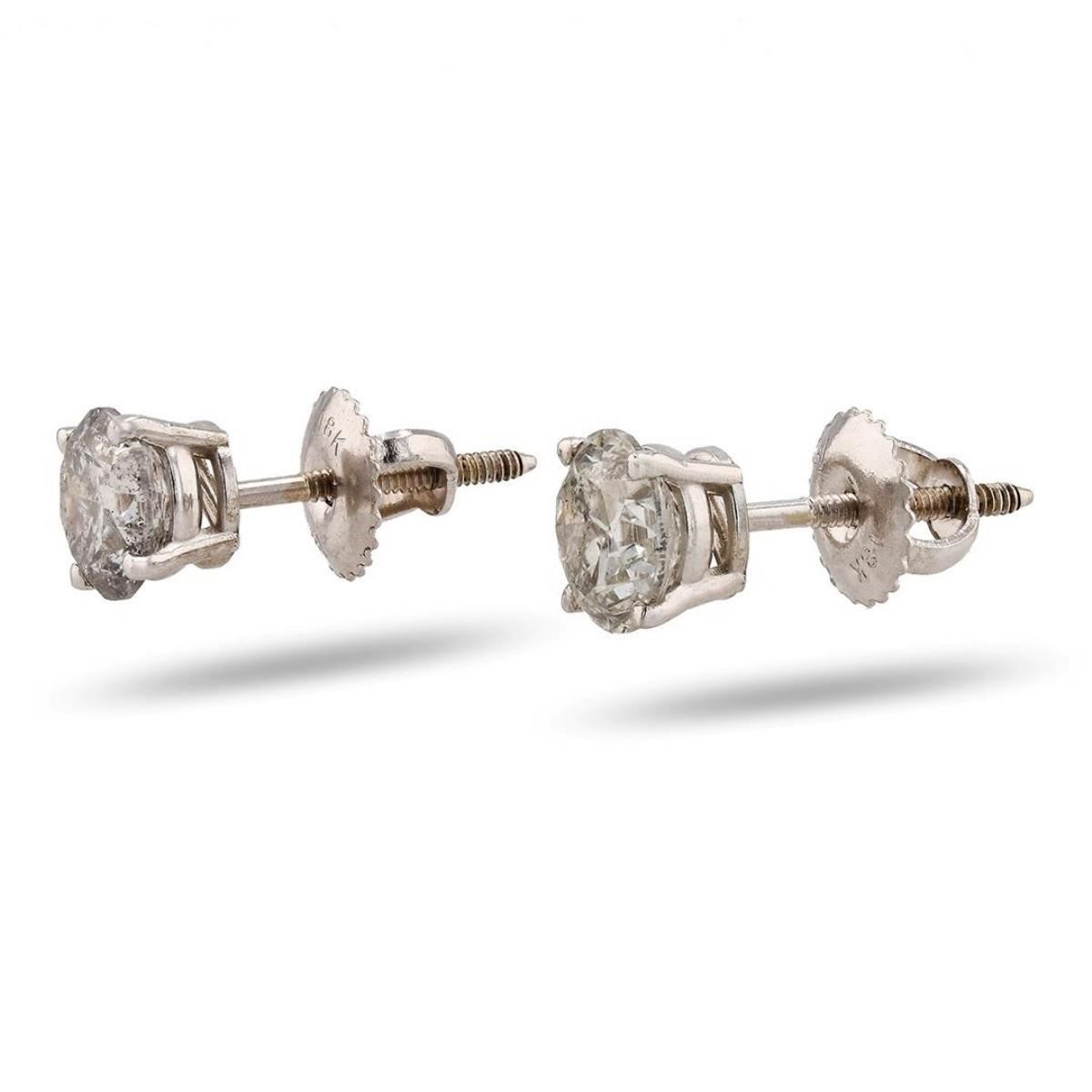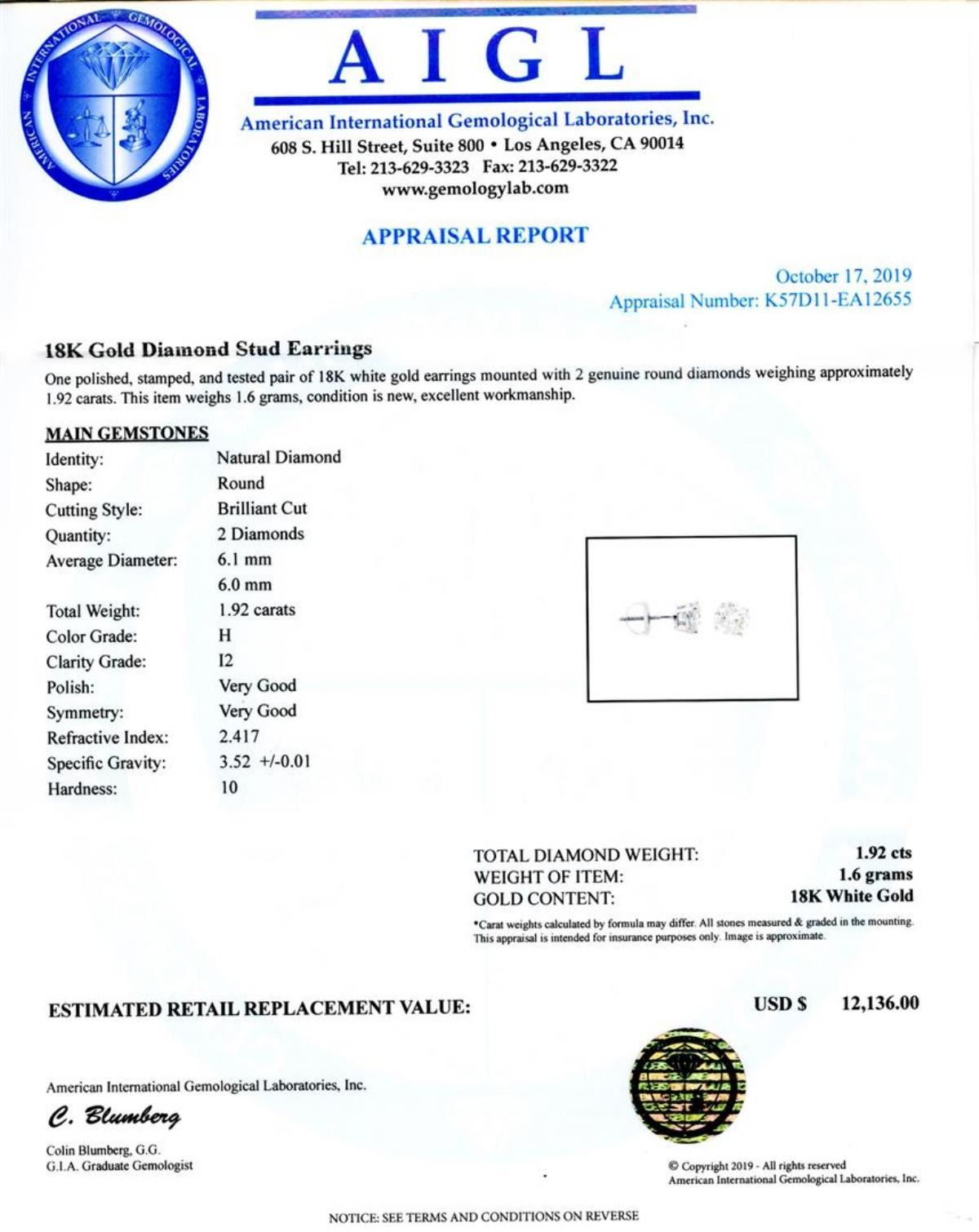 18K Gold Diamond Stud Earrings One polished, stamped, and tested pair of 18K white gold earrings mounted with 2 genuine round diamonds weighing approximately 1.92 carats. This item weighs 1.6 grams, condition is new, excellent workmanship. MAIN GEMSTONES Identity: Natural Diamond Shape: Round Cutting Style: Brilliant Cut Quantity: 2 Diamonds Average Diameter: 6.1 mm 6.0 mm Total Weight: 1.92 carats Color Grade: H Clarity Grade: I-2 Polish: Very Good Symmetry: Very Good Refractive Index: 2.417 Specific Gravity: 3.52 +1-0.01 Hardness: 10 TOTAL DIAMOND WEIGHT: 1.92 cts WEIGHT OF ITEM: 1.6 grams GOLD CONTENT: 18K White Gold
