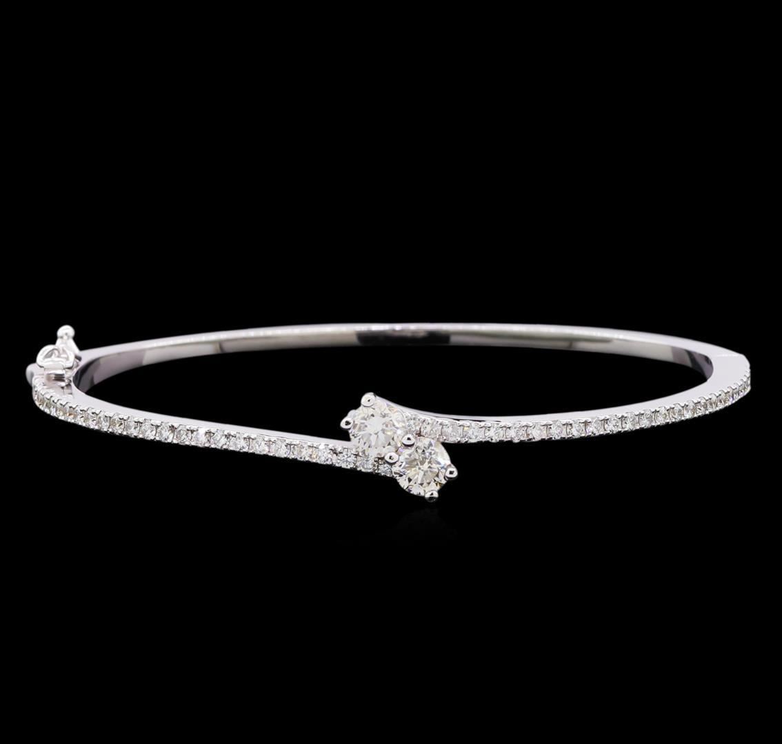 One electronically tested 14KT white gold lady's combination cast & assembled fashion bracelet with a foldover clasp with a bright polish finish. The featured lady's bracelet measures 5 inches in length. Identified with markings of "K14". Condition is new, good workmanship. Containing: Two prong set round brilliant cut diamonds, measuring 4.86 - 4.80 x 3.35mm (depth est.) , 5.00.%. GTCF approximate total weight of 2 Stones = 1.02ct. Graded in the setting. Clarity: SI-1 to SI-2. Color: H - I. Cut Good Fifty prong set round brilliant cut diamonds, measuring 1.70 - 1.65 x 1.04mm (depth est.) approximate total weight of 50 Stones = 0.90 ct. Graded in the setting. Clarity: SI-1 to SI-2. Color: G - Good. Total Weight of Diamonds 1.92ct. Total Weight of Bracelet 13.30gm. GAS Appraised.