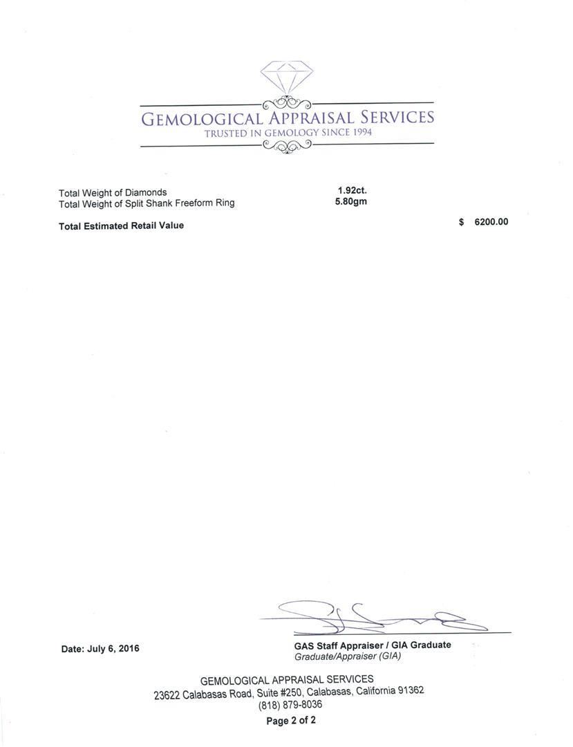 One electronically tested 14KT white gold lady's cast fashion split shank freeform ring with a bright polish finish. The featured lady's has a shank measuring 2.62 millimeters in width. Identified with markings of "K14". Condition is new, good workmanship. Containing: Nine prong set round brilliant cut diamonds, measuring 3.05 - 2.95 x 1.87mm (depth est.) approximate total weight of 9 Stones = 0.96ct. Graded in the setting. Clarity: VS-2 to SI-1. Color: H - I. Cut Very Good Six prong set round brilliant cut diamonds, measuring 2.70 - 2.60 x 1.67mm (depth est.) approximate total weight of 6 Stones = 0.46ct. Graded in the setting. Clarity: SI-1 to SI-2. Color: H - I. Cut Good Seven prong set round brilliant cut diamonds, measuring 1.80 - 1.70 x 1.07mm (depth est.) approximate total weight of 7 Stones = 0.15ct. Graded in the setting. Clarity: SI-1 to SI-2. Color: H - I. Cut Good Fifty-Two prong set round brilliant cut diamonds, measuring 1.25 - 1.20 x 0.75mm (depth est.) approximate total weight of 52 Stones = 0.35ct. Graded in the setting. Clarity: SI-1 to I-1. Color: H - I. Cut Good. Total Weight of Diamonds 1.92ct. Total Weight of Split Shank Freeform Ring 5.80gm. GAS Appraised.