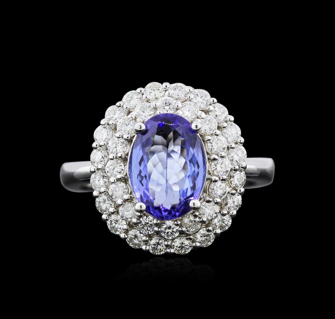 One electronically tested 14KT white gold ladies cast tanzanite and diamond ring with a bright polish finish. The featured tanzanite is set within tiered diamond bezels, completed by a three millimeter wide band. Identified with markings of "K14". Condition is new, good workmanship. Containing: One prong set oval mixed cut natural tanzanite approximate weight of 1.92ct., clarity is eye clean, type I, medium dark, very slightly grayish, bluish violet color, (GIA bV 6/3), cut is good. Transmitting light with no distortion, transparent. Graded in the setting. Tanzanite is a very rare gemstone that is only found in the country of Tanzania. Originally discovered in 1967. Tiffany & Company, named the stone Tanzanite. It is found in the Usumburu Mountains that border the Umba Valley of northern Tanzania. Tanzanite occurs in gray, brown, violet, blue, reddish-purple, & green. The gem is interesting because of its exceptional pleochroism. Rotated in different directions a tanzanite will exhibit multiple changes of color. Tanzanite has a low tolerance to ultrasonic cleaning, and should not be cleaned using this method. Thirty-Six prong set round brilliant cut diamonds approximate total weight of 36 Stones = 1.00ct. Graded in the setting. Clarity SI-2 to I-1 Color H - J. Total Weight of Colored Stones 1.92ct. Total Weight of Diamonds 1.00ct. Total Weight of Ring 5.97 grams. AIG Appraised at $7,325.00.