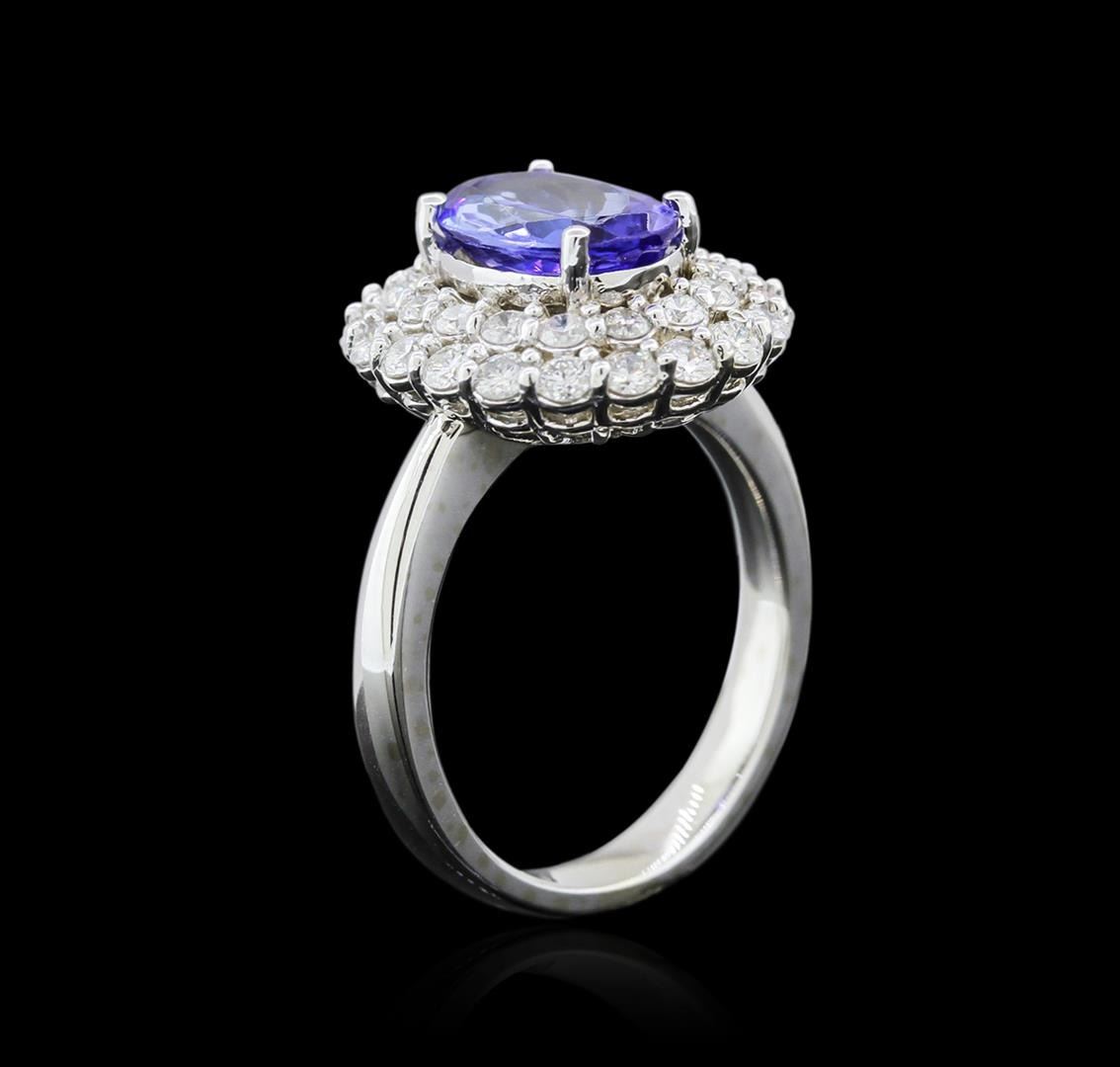 One electronically tested 14KT white gold ladies cast tanzanite and diamond ring with a bright polish finish. The featured tanzanite is set within tiered diamond bezels, completed by a three millimeter wide band. Identified with markings of "K14". Condition is new, good workmanship. Containing: One prong set oval mixed cut natural tanzanite approximate weight of 1.92ct., clarity is eye clean, type I, medium dark, very slightly grayish, bluish violet color, (GIA bV 6/3), cut is good. Transmitting light with no distortion, transparent. Graded in the setting. Tanzanite is a very rare gemstone that is only found in the country of Tanzania. Originally discovered in 1967. Tiffany & Company, named the stone Tanzanite. It is found in the Usumburu Mountains that border the Umba Valley of northern Tanzania. Tanzanite occurs in gray, brown, violet, blue, reddish-purple, & green. The gem is interesting because of its exceptional pleochroism. Rotated in different directions a tanzanite will exhibit multiple changes of color. Tanzanite has a low tolerance to ultrasonic cleaning, and should not be cleaned using this method. Thirty-Six prong set round brilliant cut diamonds approximate total weight of 36 Stones = 1.00ct. Graded in the setting. Clarity SI-2 to I-1 Color H - J. Total Weight of Colored Stones 1.92ct. Total Weight of Diamonds 1.00ct. Total Weight of Ring 5.97 grams. AIG Appraised at $7,325.00.