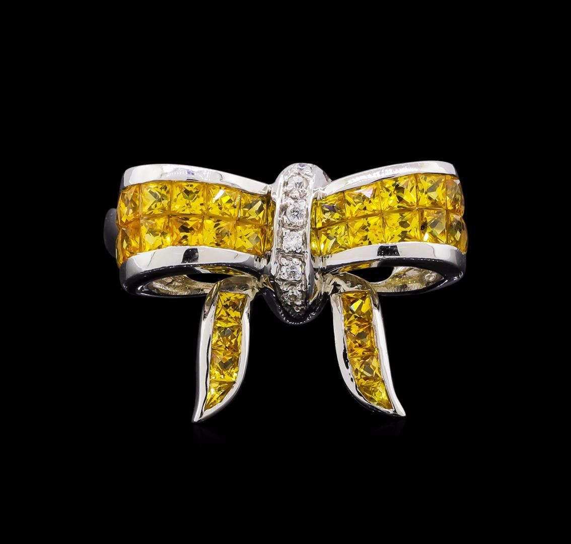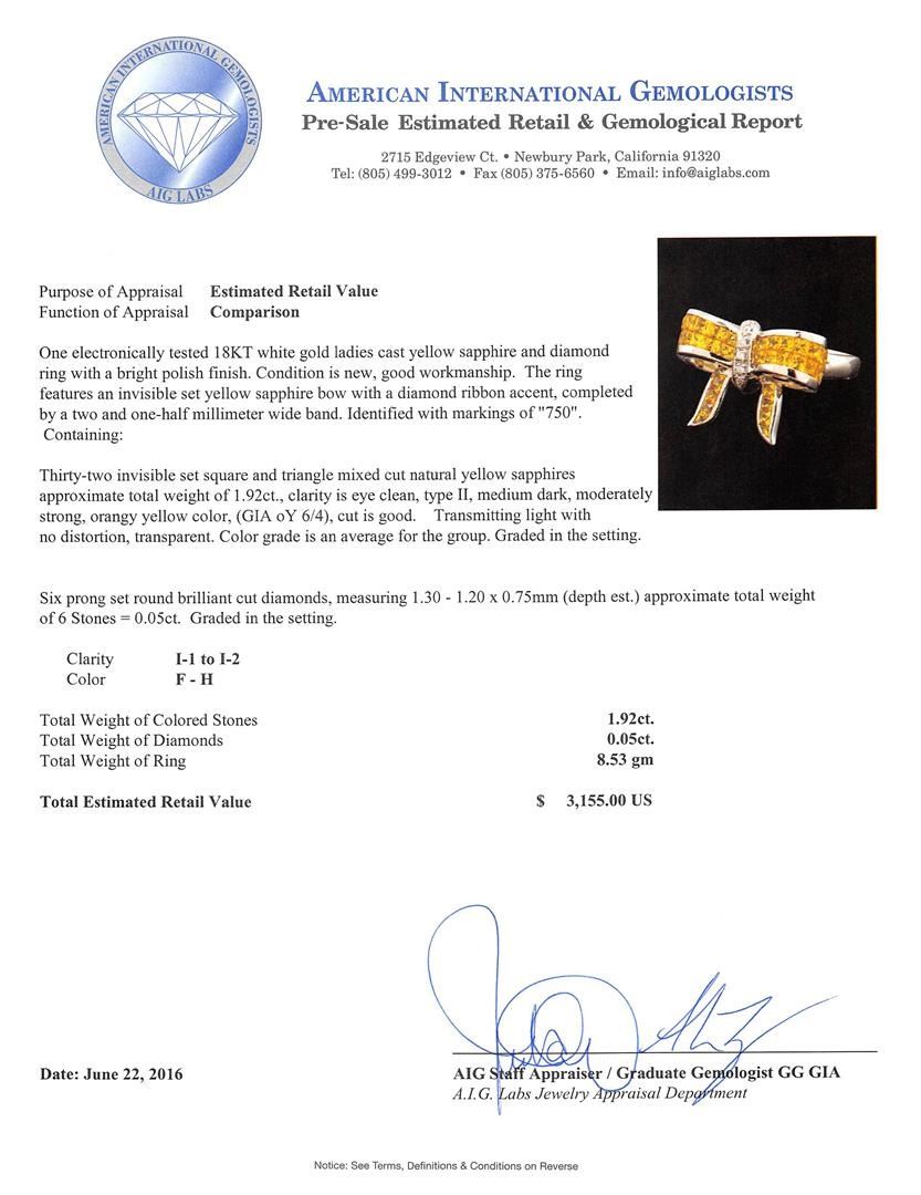 One electronically tested 18KT white gold ladies cast yellow sapphire and diamond ring with a bright polish finish. The ring features an invisible set yellow sapphire bow with a diamond ribbon accent, completed by a two and one-half millimeter wide band. Identified with markings of "750". Condition is new, good workmanship. Containing: Thirty-two invisible set square and triangle mixed cut natural yellow sapphires approximate total weight of 1.92ct., clarity is eye clean, type II, medium dark, moderately strong, orangy yellow color, (GIA oY 6/4), cut is good. Transmitting light with no distortion, transparent. Color grade is an average for the group. Graded in the setting. Six prong set round brilliant cut diamonds, measuring 1.30 - 1.20 x 0.75mm (depth est.) approximate total weight of 6 Stones = 0.05ct. Graded in the setting. Clarity: I-1 to I-2 . Color: F - H. Total Weight of Colored Stones 1.92ct.. Total Weight of Diamonds 0.05ct.. Total Weight of Ring 8.53gm. AIG Appraised at $3,155.00.