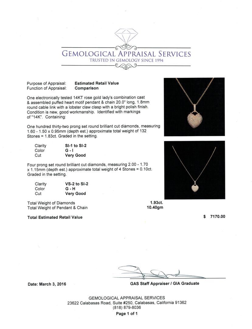 One electronically tested 14KT rose gold lady's combination cast & assembled puffed heart motif pendant & chain 20.0" long, 1.8mm round cable link with a lobster claw clasp with a bright polish finish. Identified with markings of "14K". Condition is new, good workmanship. Containing: One Hundred Thirty-Two prong set round brilliant cut diamonds, measuring 1.60 - 1.50 x 0.95mm (depth est.) approximate total weight of 132 Stones = 1.83ct. Graded in the setting. Clarity: SI-1 to SI-2. Color: G - I. Cut Very Good Four prong set round brilliant cut diamonds, measuring 2.00 - 1.70 x 1.15mm (depth est.) approximate total weight of 4 Stones = 0.10ct. Graded in the setting. Clarity: VS-2 to SI-2. Color: G - Very Good. Total Weight of Diamonds 1.93ct. Total Weight of Pendant & Chain 10.40gm. GAS Appraised at $7,170.00.