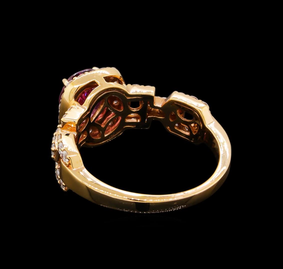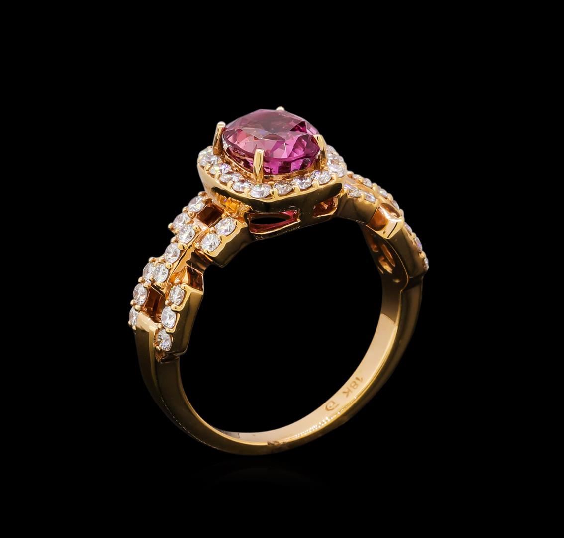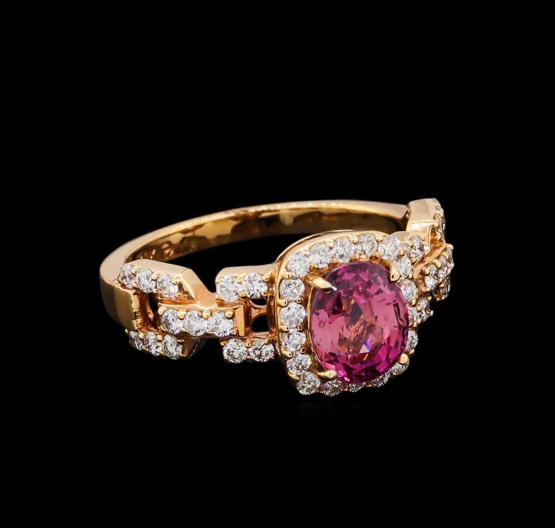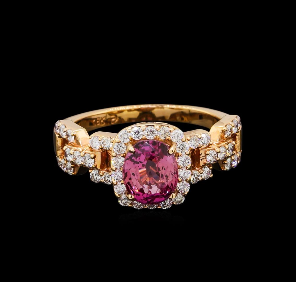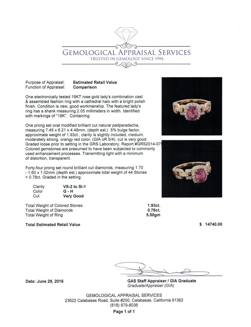 One electronically tested 18KT rose gold lady's combination cast & assembled fashion ring with a cathedral halo with a bright polish finish. The featured lady's ring has a shank measuring 2.05 millimeters in width. Identified with markings of "18K". Condition is new, good workmanship. Containing: One prong set oval modified brilliant cut natural padparadscha, measuring 7.45 x 6.21 x 4.48mm, (depth est.) 5%. bulge factor, approximate weight of 1.93ct., clarity is slightly included, medium, moderately strong, orangy red color, (GIA oR 5/4), cut is very good. Graded loose prior to setting in the GRS Laboratory, Report #GRS2014-075504. Colored gemstones are presumed to have been subjected to commonly used enhancement processes. Transmitting light with a minimum of distortion, transparent. Forty-Four prong set round brilliant cut diamonds, measuring 1.70 - 1.60 x 1.02mm (depth est.) approximate total weight of 44 Stones = 0.78ct. Graded in the setting. Clarity: VS-2 to SI-1. Color: G - Very Good. Total Weight of Colored Stones 1.93ct. Total Weight of Diamonds 0.78ct. Total Weight of Ring 5.50gm. GAS Appraised at $14,740.00.