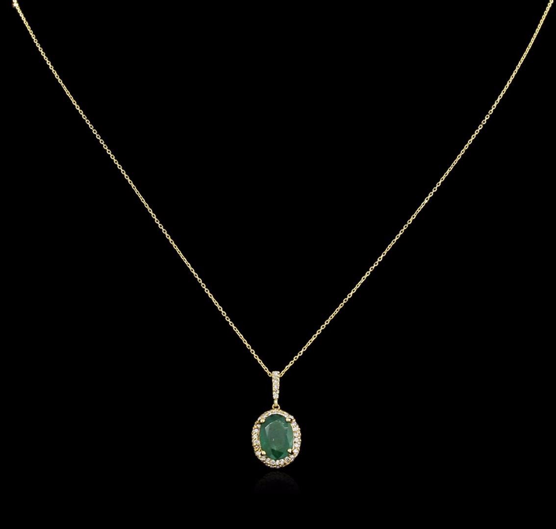 One electronically tested 14KT yellow gold lady's combination cast & assembled fashion pendant & chain 16.0" long, 0.80mm diamond cut cable link with a spring ring clasp with a halo with a bright polish finish. Identified with markings of "14K". Condition is new, good workmanship. Containing: One prong set oval modified brilliant cut natural emerald, measuring 9.56 x 7.01 x 4.34mm, 10% bulge factor, approximate weight of 1.93ct., clarity is heavily included, type III, dark, very slightly grayish, very slightly bluish green color, (GIA vslbG 7/3), cut is good. Transmitting light somewhat diffusely, semi-transparent to translucent. Naturally occurring internal & external characteristics are present. Indications of oil residue. Graded in the setting. Sixty-Six prong set round brilliant cut diamonds, measuring 1.10 - 1.00 x 0.68mm (depth est.) approximate total weight of 66 Stones = 0.30ct. Graded in the setting. Clarity: SI-2 to I-1. Color: H - I. Cut Good. Total Weight of Colored Stones 1.93ct. Total Weight of Diamonds 0.30ct. Total Weight of Pendant & Chain 2.20gm. GAS Appraised at $2,915.00.