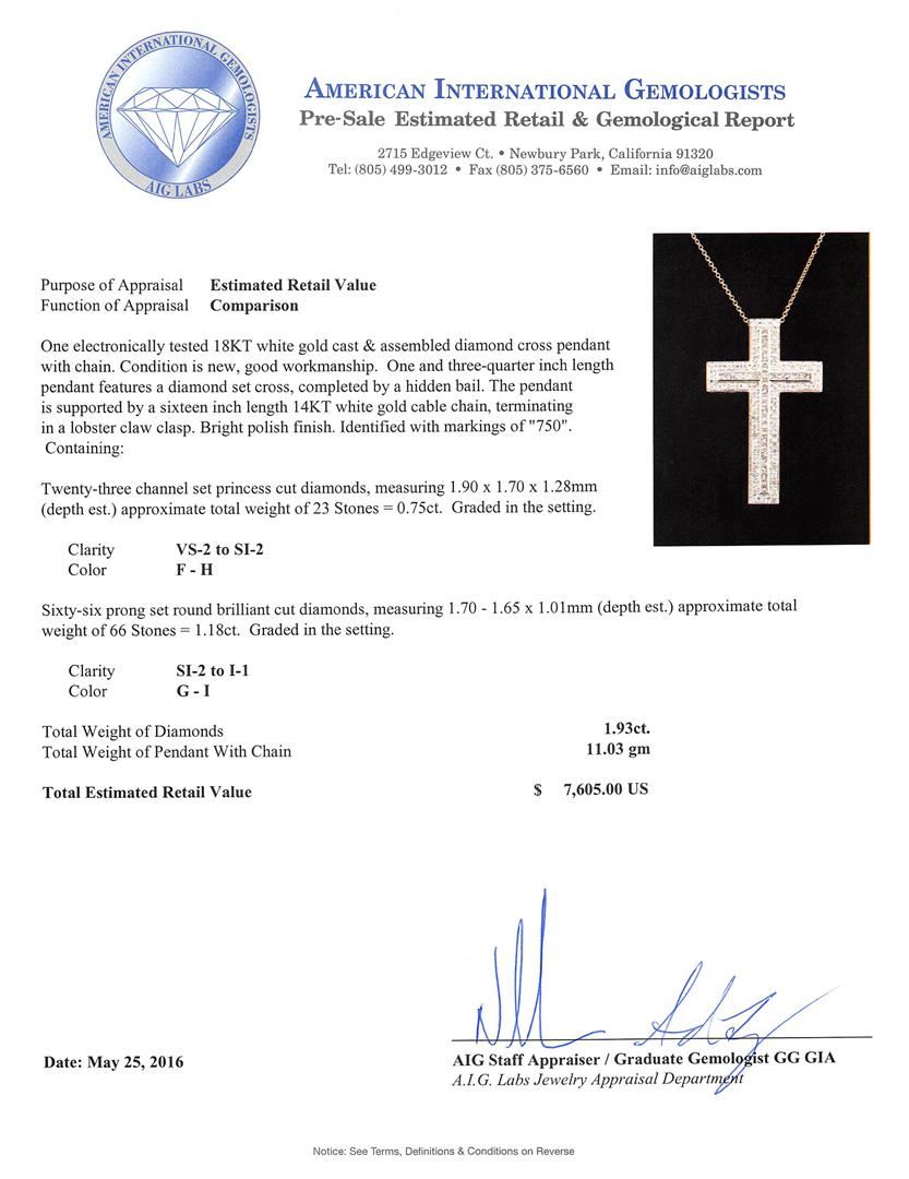 One electronically tested 18KT white gold cast & assembled diamond cross pendant with chain. One and three-quarter inch length pendant features a diamond set cross, completed by a hidden bail. The pendant is supported by a sixteen inch length 14KT white gold cable chain, terminating in a lobster claw clasp. Bright polish finish. Identified with markings of "750". Condition is new, good workmanship. Containing: Twenty-Three channel set princess cut diamonds, measuring 1.90 x 1.70 x 1.28mm (depth est.) approximate total weight of 23 Stones = 0.75ct. Graded in the setting. Clarity: VS-2 to SI-2. Color: F - H Sixty-Six prong set round brilliant cut diamonds, measuring 1.70 - 1.65 x 1.01mm (depth est.) approximate total weight of 66 Stones = 1.18ct. Graded in the setting. Clarity: SI-2 to I-1. Color: G - I. Total Weight of Diamonds 1.93ct. Total Weight of Pendant With Chain 11.03gm. AIG Appraised at $7,605.00.