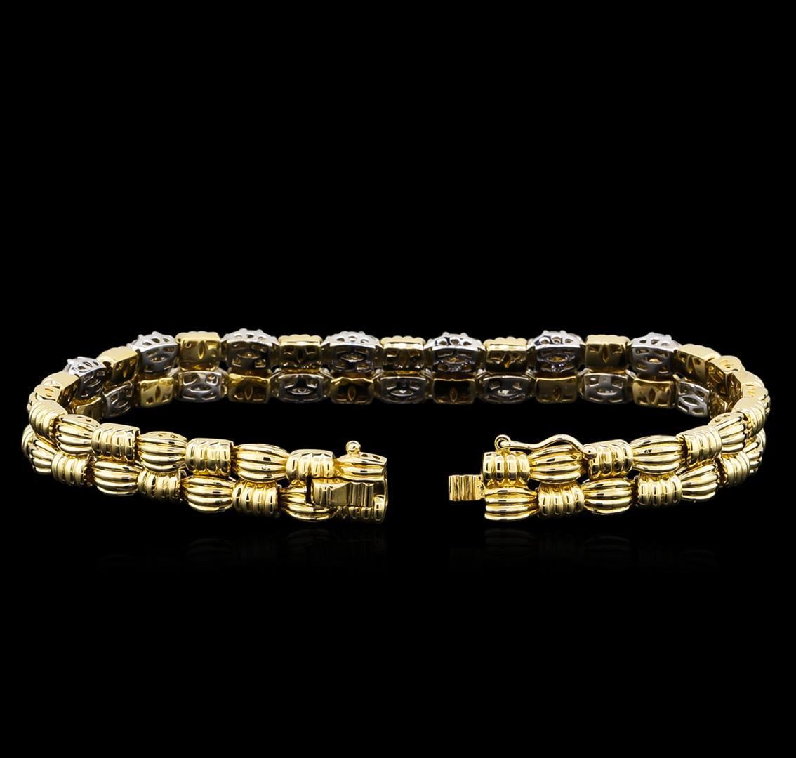 One electronically tested 14KT white and yellow gold lady's combination cast & assembled fashion bracelet with a tongue clasp with foldover safety with a bright polish finish. The featured lady's bracelet has a basket weave motif and measures approximately 7.9 millimeters in width and 7.25 inches in length. Identified with markings of "K14". Condition is new, good workmanship. Containing: Sixty prong set round brilliant cut diamonds, measuring 1.70 - 1.65 x 1.06mm (depth est.) approximate total weight of 60 Stones = 1.10 ct. Graded in the setting. Clarity: SI-1 to SI-2. Color: H - I. Cut Good Thirty prong set round brilliant cut diamonds, measuring 2.00 - 1.90 x 1.21mm (depth est.) approximate total weight of 30 Stones = 0.84ct. Graded in the setting. Clarity: SI-1 to SI-2. Color: H - I. Cut Good. Total Weight of Diamonds 1.94ct. Total Weight of Bracelet 23.90gm. GAS Appraised.