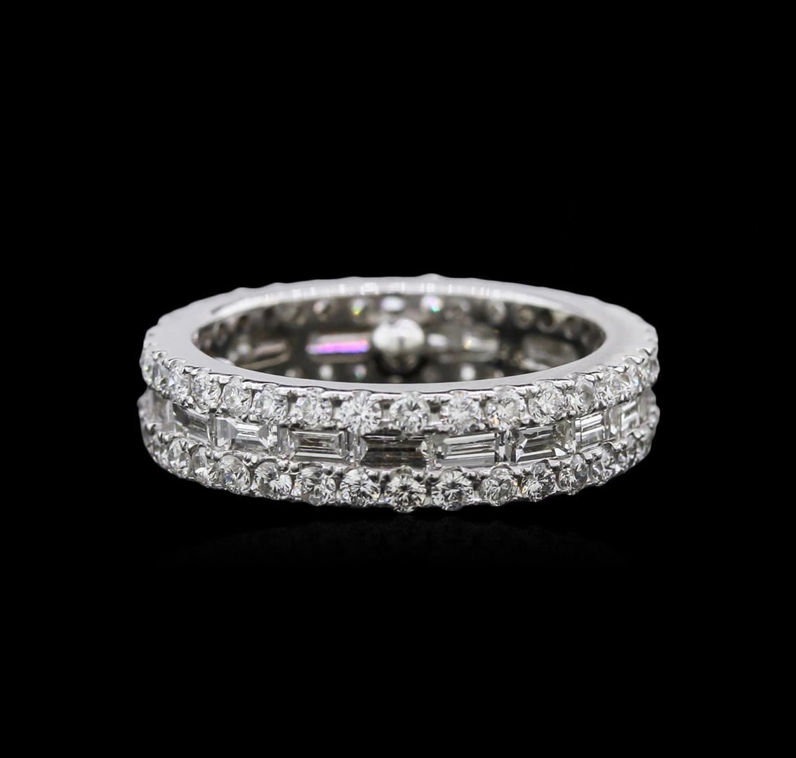 One electronically tested 14KT white gold ladies cast diamond eternity ring with a bright polish finish. Condition is very good. Containing: Seventy-Two prong set round brilliant cut diamonds, measuring 1.50 - 1.50 x 0.90mm (depth est.) approximate total weight of 72 Stones = 0.89ct. Clarity: SI-1 to SI-2. Color: H - I, Cut is Good. Twenty channel set baguette cut diamonds, measuring 3.00 x 1.50 x 1.28mm (depth est.) approximate total weight of 20 Stones = 1.05ct. Clarity: VS-1 to VS-2. Color: G - H, Cut is Good. Diamonds are graded in the mounting, unless otherwise stated. Total Weight of Diamonds 1.94ct. Total Weight of Eternity Ring 4.10 grams. GGL Appraised at $4,020.00.