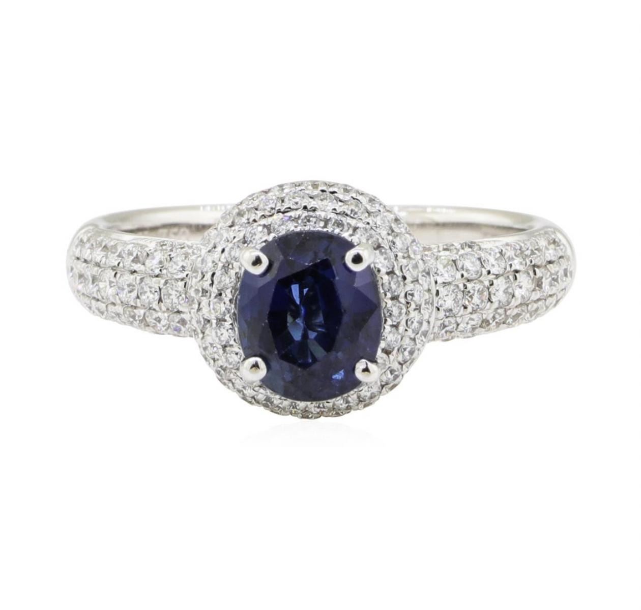 One electronically tested 18KT white gold lady's cast fashion ring with a half dome shank with a halo with a bright polish finish. The featured lady's ring has a shank measuring 2.30 millimeters wide. Identified with markings of '18K 750'. Condition is new, good workmanship. Containing: One prong set oval modified mixed cut natural blue sapphire, measuring 6.75 x 5.65 x 3.75mm, (depth est.) 5%. bulge factor, approximate weight of 1.31ct., clarity is eye clean, medium dark, moderately strong, very slightly greenish blue color, (GIA vslgB 6/4), cut is good. Transmitting light with no distortion, transparent. Colored gemstones are presumed to have been subjected to commonly used enhancement processes. Graded in the setting. Forty-Two prong set round brilliant cut diamonds, measuring 1.30 - 1.25 x 0.79mm (depth est.) approximate total weight of 42 Stones = 0.34ct. Graded in the setting. Color G - H Clarity VS-2 to SI-1 Cut Very Good Seventy-Eight prong set round brilliant cut diamonds, measuring 1.10 - 0.95 x 0.62mm (depth est.) approximate total weight of 78 Stones = 0.29ct. Graded in the setting. Color G - H Clarity VS-2 to SI-1 Cut Very Good. Total Weight of Colored Stones 1.31ct.. Total Weight of Diamonds 0.63ct.. Total Weight of Ring 4.60gm GAS Appraised at $5260.00. GAS Appraised.