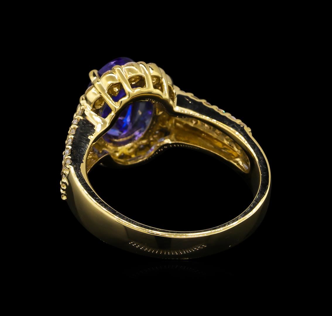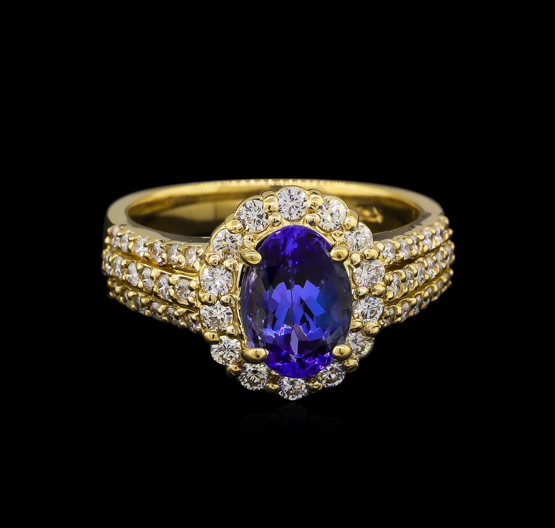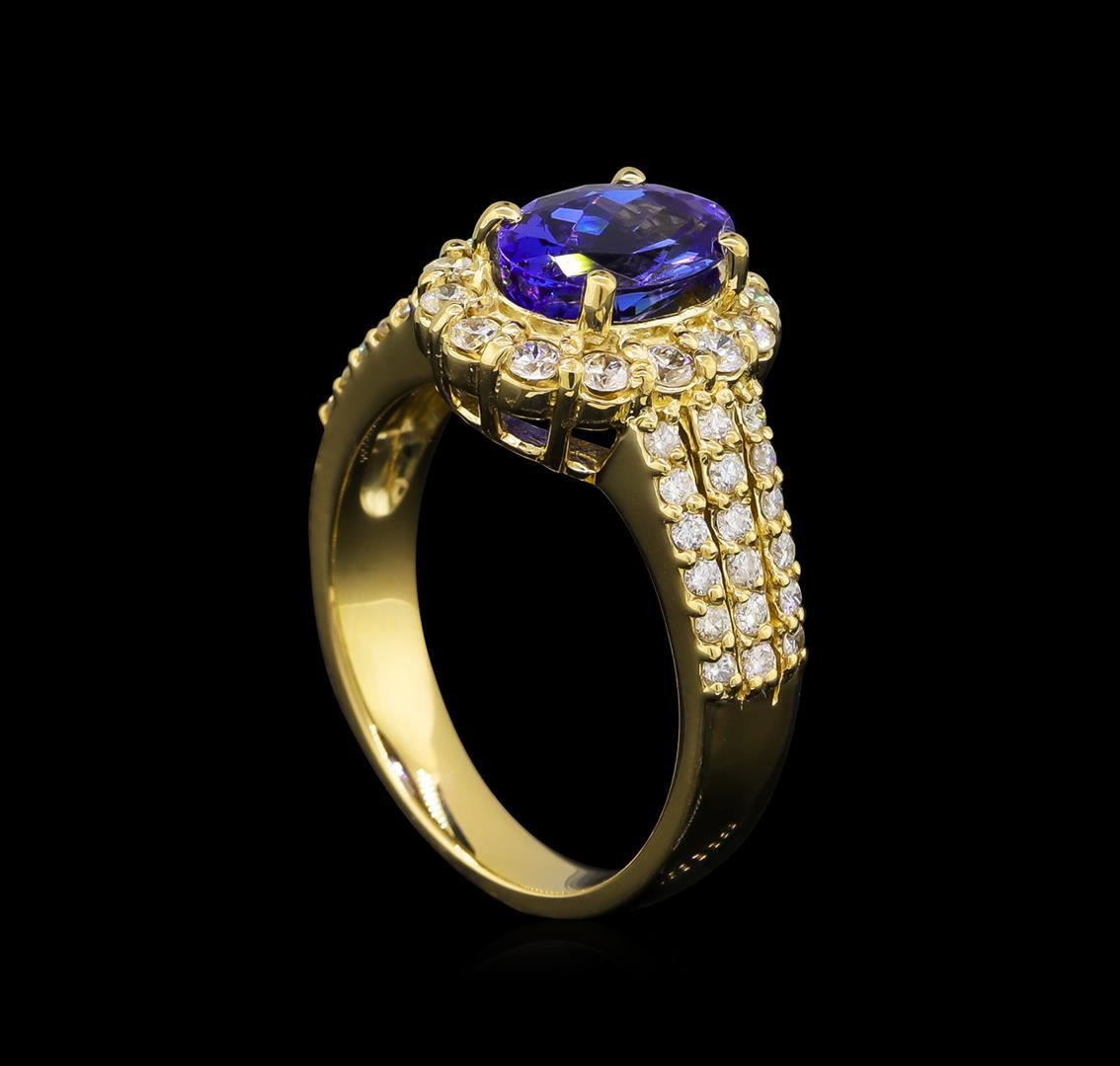 One electronically tested 14KT yellow gold lady's cast fashion ring with a basket halo with a bright polish finish. The featured lady's ring has a shank measuring 3.34 millimeters wide. Identified with markings of "K14". Condition is new, good workmanship. Containing: One prong set oval modified brilliant cut natural tanzanite, measuring 9.25 x 6.30 x 4.64mm, approximate weight of 1.94ct., clarity is eye clean, type I, medium, moderately strong, violetish blue color, (GIA vB 5/4), cut is very good. Transmitting light with no distortion, transparent. Colored gemstones are presumed to have been subjected to commonly used enhancement processes. Graded in the setting. Thirty-Six prong set round brilliant cut diamonds, measuring 1.40 - 1.25 x 0.84mm (depth est.) approximate total weight of 36 Stones = 0.35ct. Graded in the setting. Clarity: SI-1 to I-1. Color: H - I. Cut Good Fourteen prong set round brilliant cut diamonds, measuring 2.00 - 1.90 x 1.21mm (depth est.) approximate total weight of 14 Stones = 0.40ct. Graded in the setting. Clarity: SI-1 to SI-2. Color: H - I. Cut Good. Total Weight of Colored Stones 1.94ct. Total Weight of Diamonds 0.75ct. Total Weight of Ring 6.10gm. GAS Appraised at $5,520.00.