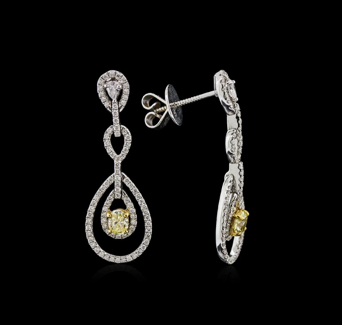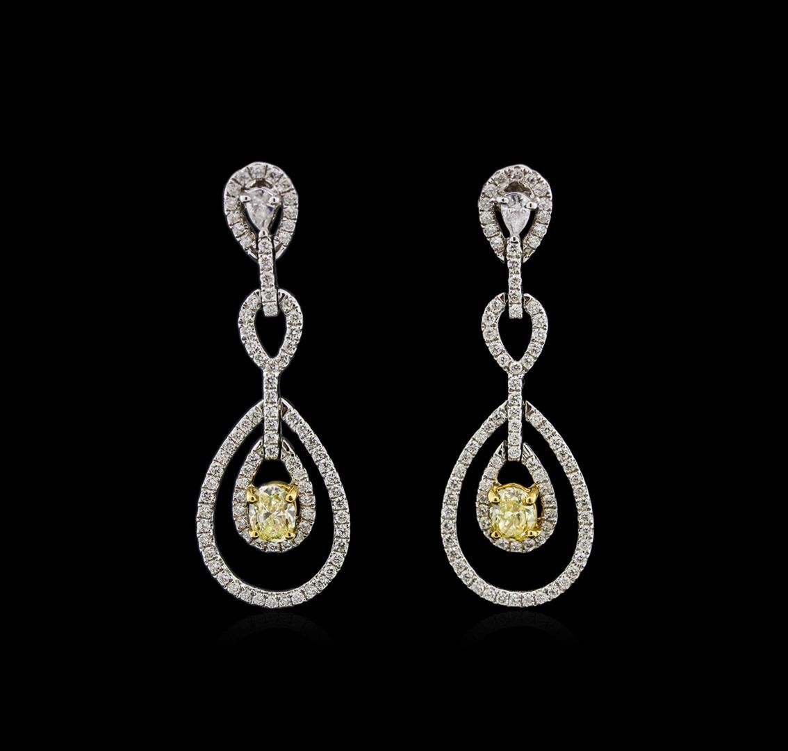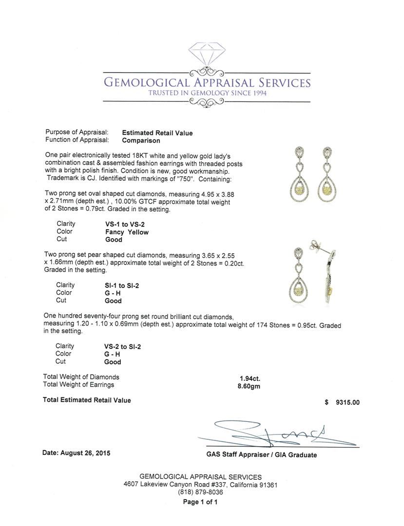 One pair electronically tested 18KT white and yellow gold lady's combination cast & assembled fashion earrings with threaded posts with a bright polish finish. Trademark is CJ. Identified with markings of "750". Condition is new, good workmanship. Containing: Two prong set oval shaped cut diamonds, measuring 4.95 x 3.88 x 2.71mm (depth est.) , 10.00.% GTCF approximate total weight of 2 Stones = 0.79ct. Graded in the setting. Clarity: VS-1 to VS-2 Cut Good Two prong set pear shaped cut diamonds, measuring 3.65 x 2.55 x 1.66mm (depth est.) approximate total weight of 2 Stones = 0.20ct. Graded in the setting. Clarity: SI-1 to SI-2. Color: G - Good One Hundred Seventy-Four prong set round brilliant cut diamonds, measuring 1.20 - 1.10 x 0.69mm (depth est.) approximate total weight of 174 Stones = 0.95ct. Graded in the setting. Clarity: VS-2 to SI-2. Color: G - Good. Total Weight of Diamonds 1.94ct. Total Weight of Earrings 8.60gm. GAS Appraised at $9,315.00.